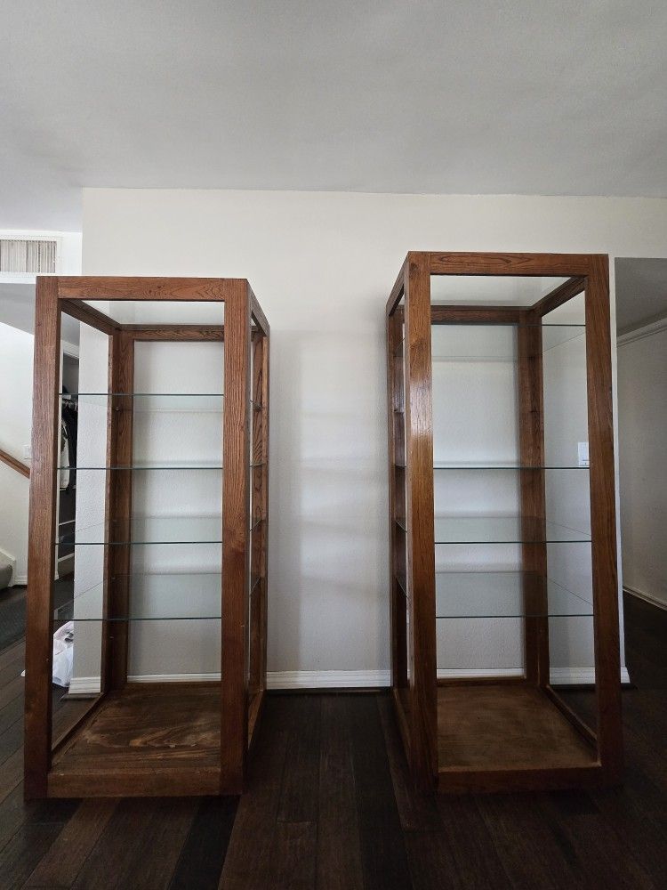 These are solid wood frame with glass shelves. Family made, high quality. Moving to smaller space. I've loved them. Great decorating spaces