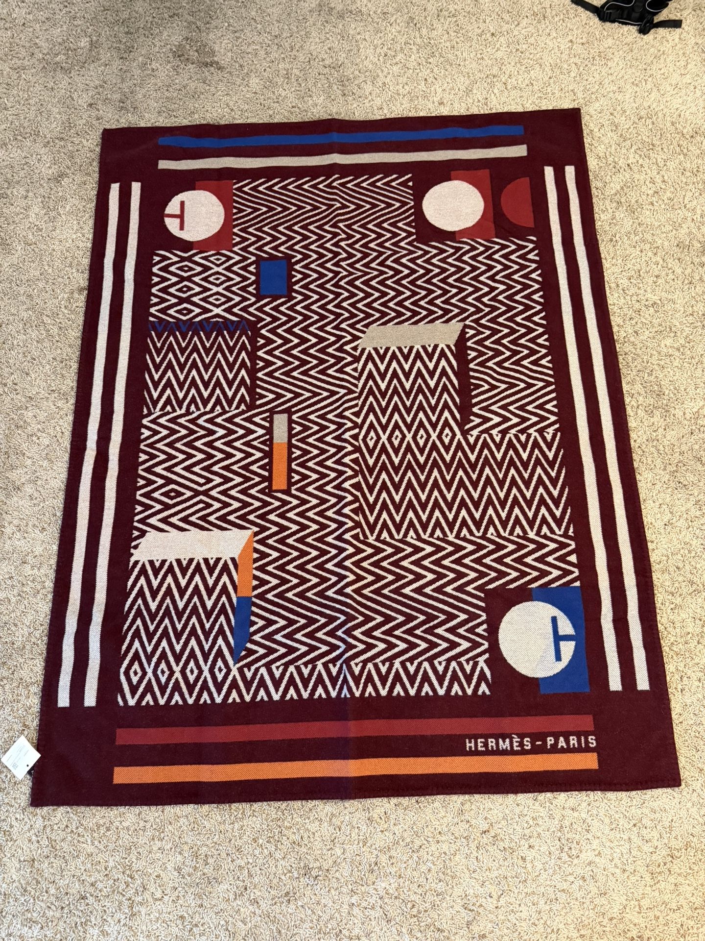 Authentic Hermès Paris luxury throw (plaid) from the Hermès home collection. • Model: Plaid Jacquard “Enigmatic” • Material: 90% Merino Wool / 10% Cashmere • Made in Great Britain • Condition: Brand new with original tags • Original retail price: $2,025 • Abstract geometric design in rich burgundy, blue, cream, and orange tones • Can be used as a sofa throw, bed cover, or decorative textile Extremely soft, heavyweight, and high quality. This is not a rug — it is a luxury Hermès throw blanket. Happy to meet locally or ship at buyer’s expense. Serious buyers only.