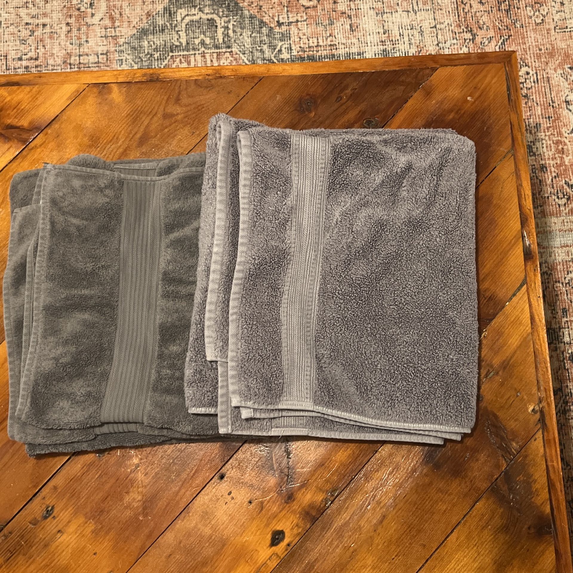 Large gray bath towels. Bought for guests but never used. Not a set but could pass as one.