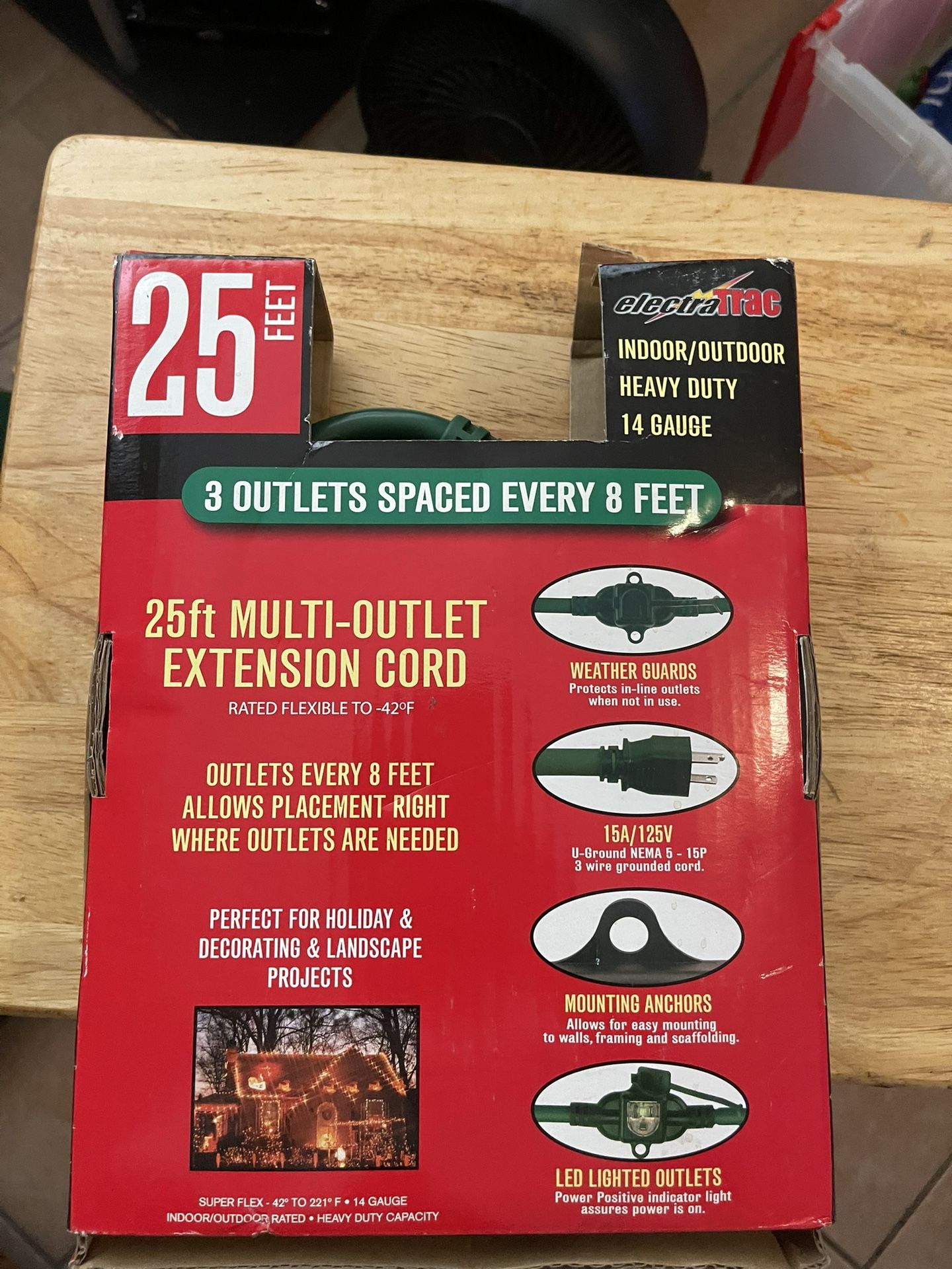 Hi, I have a brand new ElectraTRAC In-line Multi-Outlet Extension Cord 14/3 Heavy Duty 25 Foot Long(Indoor/Outdoor) usage. This item is brand spanking new. Never opened. Never used. I can meet you at the Elgin police station, Hanover Park police station, or Streamwood police station or Bartlett police station. I can also ship this item to you as well for a small shipping fee. Thanks and make it a great day.