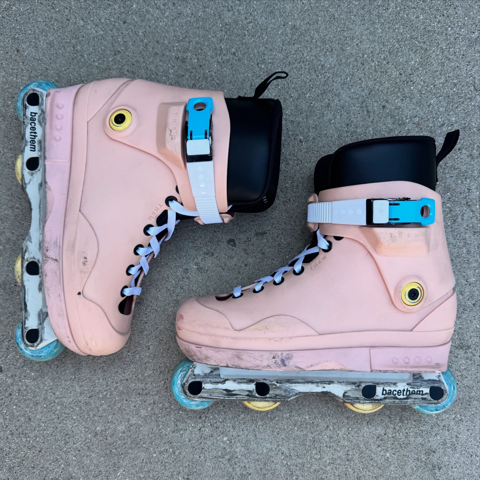 Bacemint x Them Skates 909 Bacethem complete street skates size 9-9.5 US with new stock liners, Dead shock absorbers, new laces, original box, tool, Bones Reds and Bacemint x Dead 58mm 88a-95a-95a-88a wheels for aggressive inline skating / rollerblading located in Los Angeles. Price is firm.