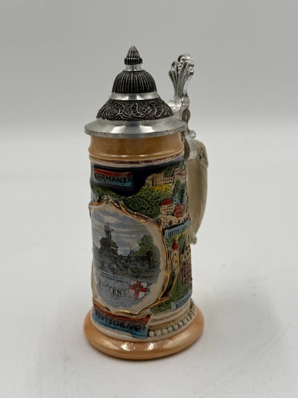 The Vintage Schmitt & Sohn Ltd. Edition Lidded Beer Stein is a collectible drinkware item handmade in Germany. This pewter stein features a classic lidded design, making it a popular choice for beer enthusiasts and collectors alike. The theme of this piece is focused on Breweriana, adding to its appeal to those interested in the history and culture surrounding beer. Made in Germany, this lidded stein showcases the craftsmanship and quality that Germany is known for in the world of beer collectibles. Authentic vintage German beer stein exclusively designed by Schmitt & Sohn, Germany. This beautifully detailed stein features colorful hand-painted scenes of famous German landmarks including Heidelberg, Neuschwanstein, Köln, and Rothenburg. The stein is finished with a decorative pewter lid and thumb lift. Marked on the bottom as hand made, hand painted, and gold painted, confirming its quality craftsmanship. A great collectible piece for beer stein collectors, German memorabilia enthusiasts, or as a decorative display item. Details: • Maker: Schmitt & Sohn • Country: Germany • Material: Ceramic with pewter lid • Technique: Hand made, hand painted, gold painted • Condition: Very good vintage condition, no cracks or chips noted • Lid: Pewter, opens and closes properly Perfect for collection, display, or gifting.