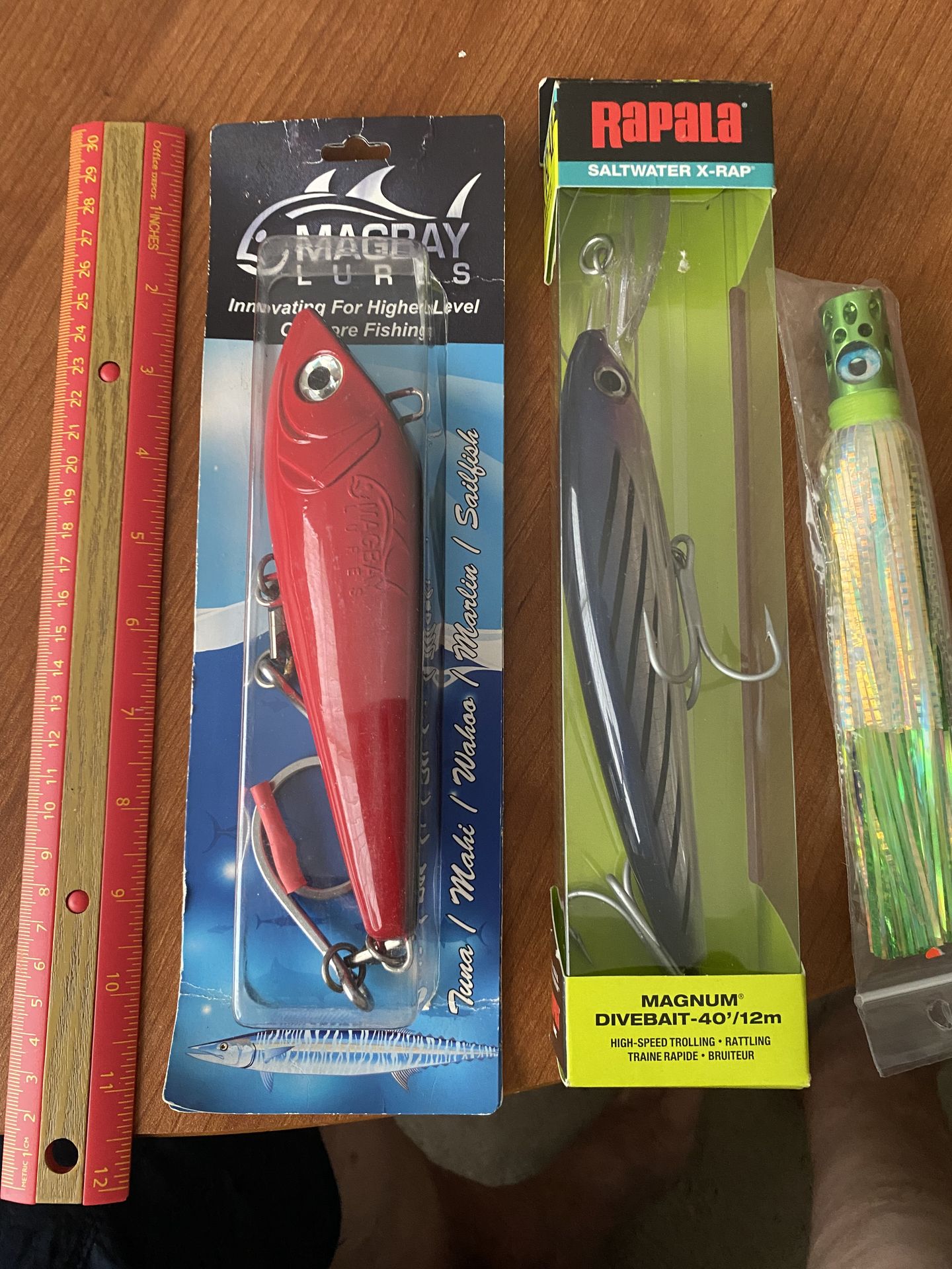Includes Magbay Lures and Rapala Saltwater X-Rap. Ideal for saltwater fishing. Magbay Lures brand lure and a Rapala X-Rap Magnum divebait. • The Rapala X-Rap Magnum is designed for high-speed trolling, featuring heavy-duty VMC hooks and capable of diving to depths of 40 feet (12 meters). • The Magbay lure is tailored for targeting large offshore species such as Tuna, Mahi, Wahoo, Marlin, and Sailfish. • These lures are engineered to withstand tough conditions and aggressive strikes from predatory fish. Red mag bay cost $28 alone All new Delray This is for big fish like tuna mahi wahoo marlin and sailfish Price is for all 3