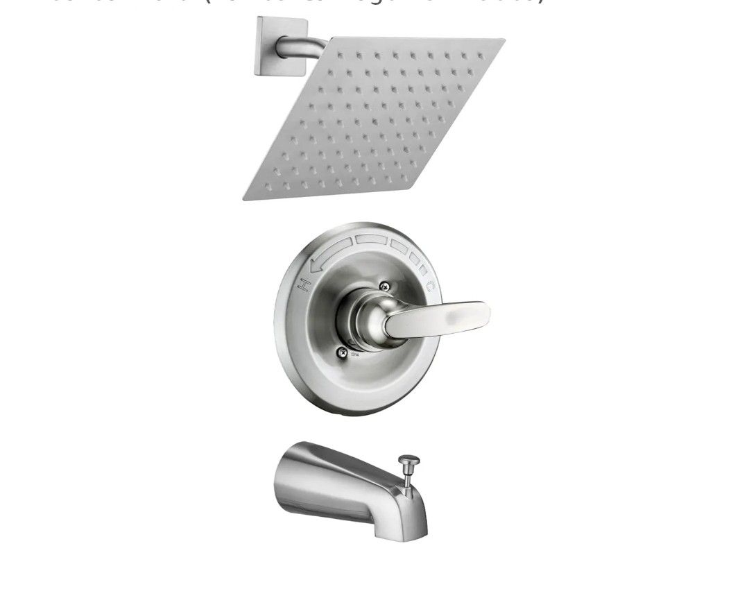 7332: New 8" Rain Shower Faucet Tub Trim Kit for 13/14 Series, High Pressure Square Rain Shower Head& Handle Set System, Brushed Nickel (Valve& Catridge Not Inclued) Brand: Ultrimkit Color: Brushed Nickel Material: Metal Finish Type: Brushed Number of Handles: 1 Handle Material: Brass 8” High Pressure Shower Head: The combination of ultra-thin and air-in technology leads to high pressure and strong water flow. Even with lower water pressure, this flat shower head can provide an excellent shower experience. Easy DIY Project - Want to spruce up your shower area on your own? Look no further! Our easy-to-follow instructions are tailored for beginners, ensuring that even novices can tackle this project with confidence.This project is a great way to boost your experience and confidence. What Included - It has a shower head, a shower arm with flange, a tub spout and a trim kit without valve& catridge.