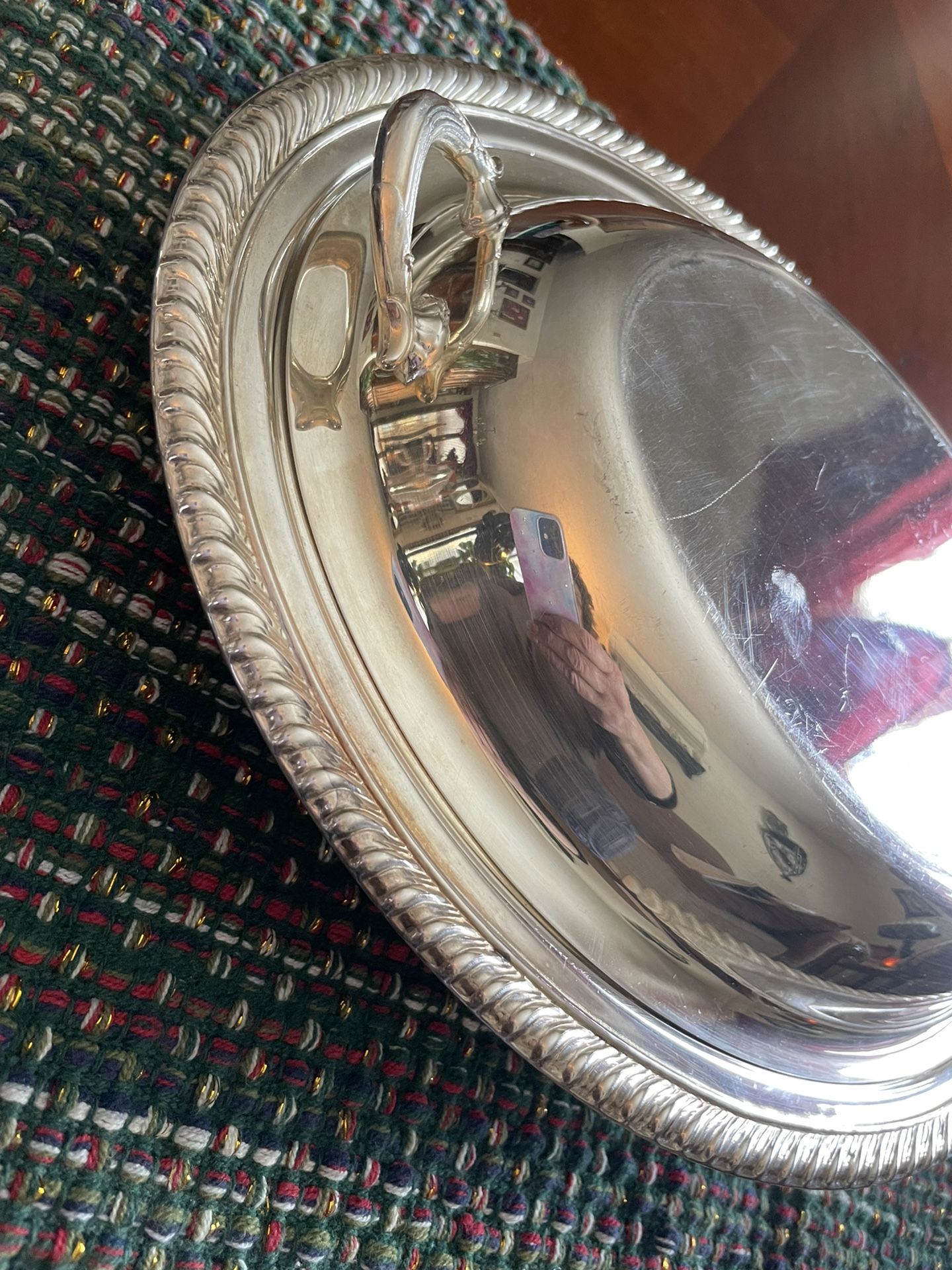 Silver serving veggie platter w/ domed lid and handles - very beautiful piece / like in the movies!! 12” long x 9” wide x 2” deep and 3” tall $60 obo If you like it - make an offer