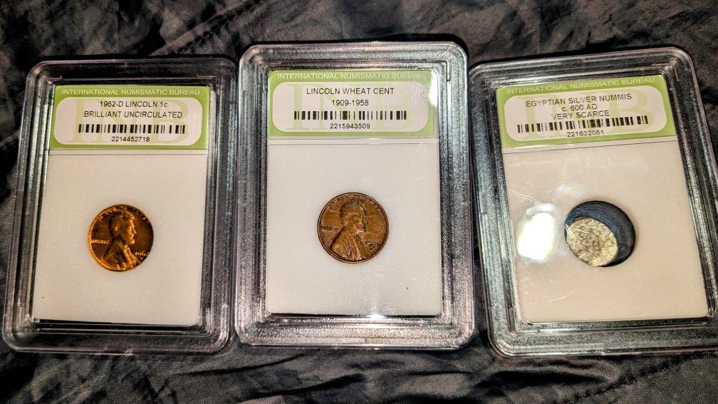 I have first 1962 D Lincoln 1 cent brilliant uncirculated, a Lincoln wheat scent 1957 d in an international numismatic bureau box. As well as I got an Egyptian silver numerus 600 AD very scarce That is also in an international numismatic bureau box. All three together 35.