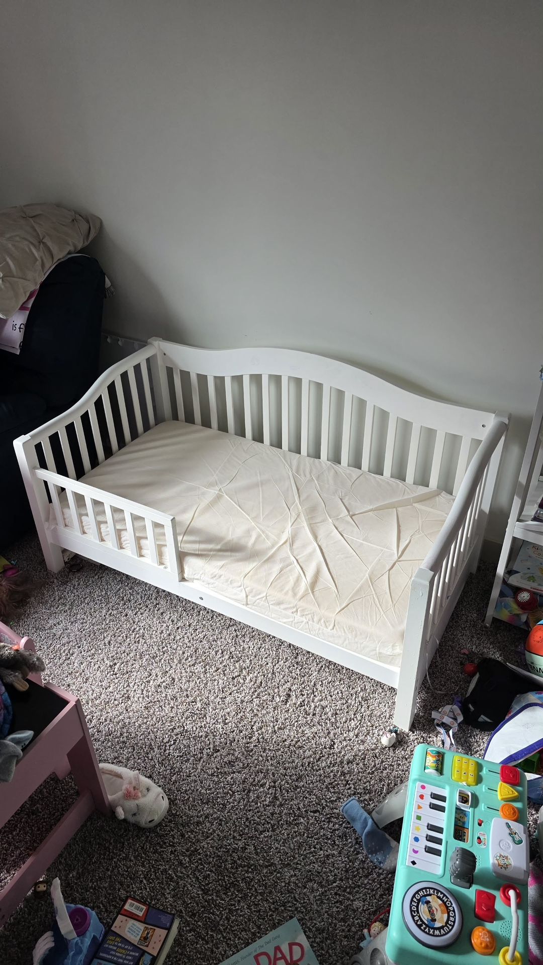 Used White, Wood, Toddler Bed, Used Toddler Mattress & Washed Mattress Protector | Fair Cosmetic Wear & Tear. Great Structural Quality. Sold As Is! Extra Parts NOT Included. Dissambled For Easy Transport. Dimensions: Depth 30", Length 54.5", Height 25.5"
