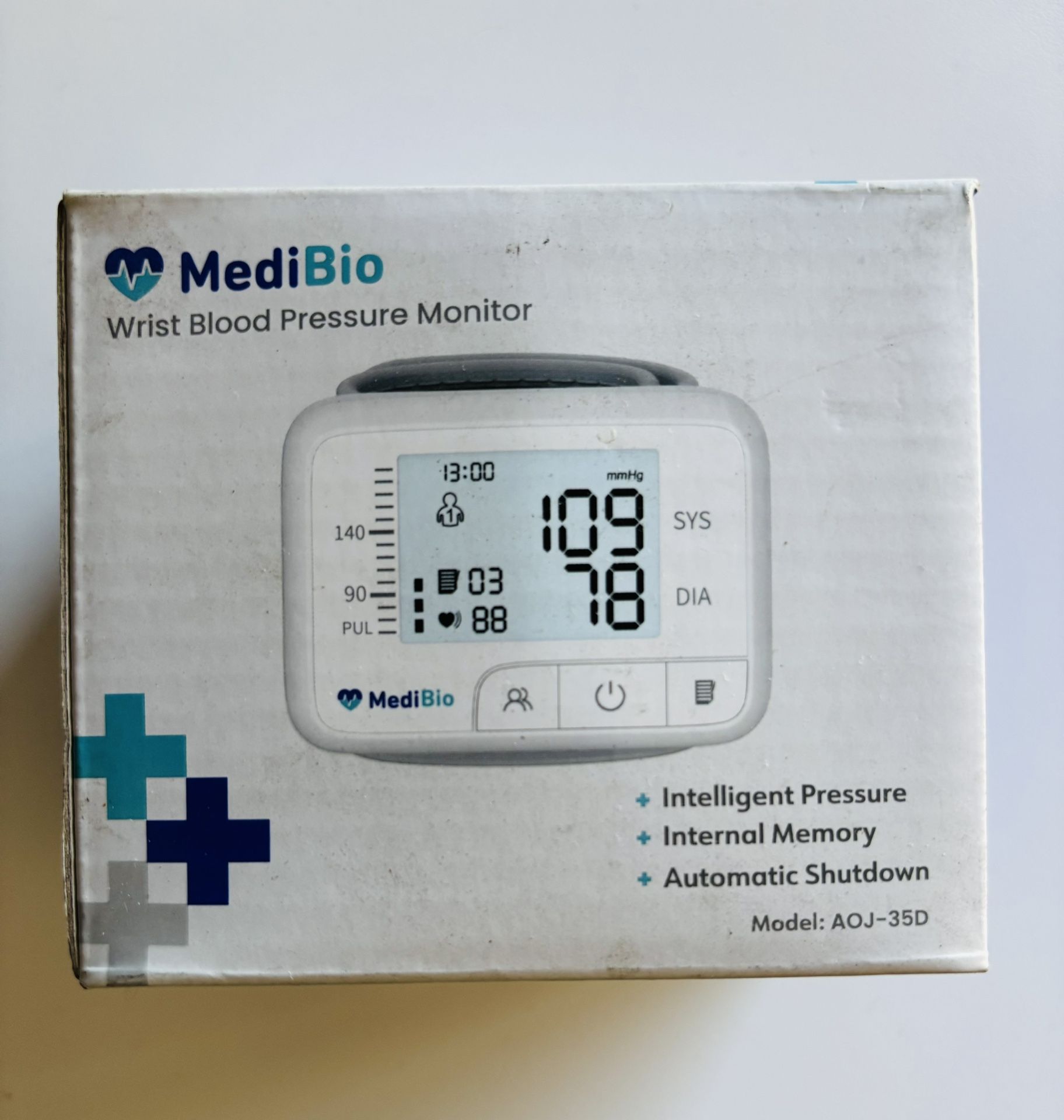Brand new in box. Get professional accuracy with a convenient and easy-to-use digital wrist blood pressure monitor from MediBio. Its large display makes reading easy, and the memory recall function holds up to 2x99 readings, making it great for multiple users. The monitor is also able to provide an accurate pulse rate reading, eliminating the need for a separate device. The unit is lightweight to go anywhere and features an auto-off function to preserve battery life. *Large easy-to-read digital display *2x99 memory recall *Accurate Result Detected By *Oscillograph *Display Pulse, Systolic Pressure & Diastolic Pressure *Irregular Heartbeat Detection (IHD) *WHO BP Classification Indicator *Automatic Power Off *Average of Last Three *Measurements *Intelligent Pressure *Internal Memory *Automatic shutdown *Model: AOJ-35D