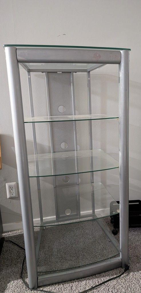 This is a VTI Manufacturing AGR404S 4 glass shelves AV stand with silver poles.