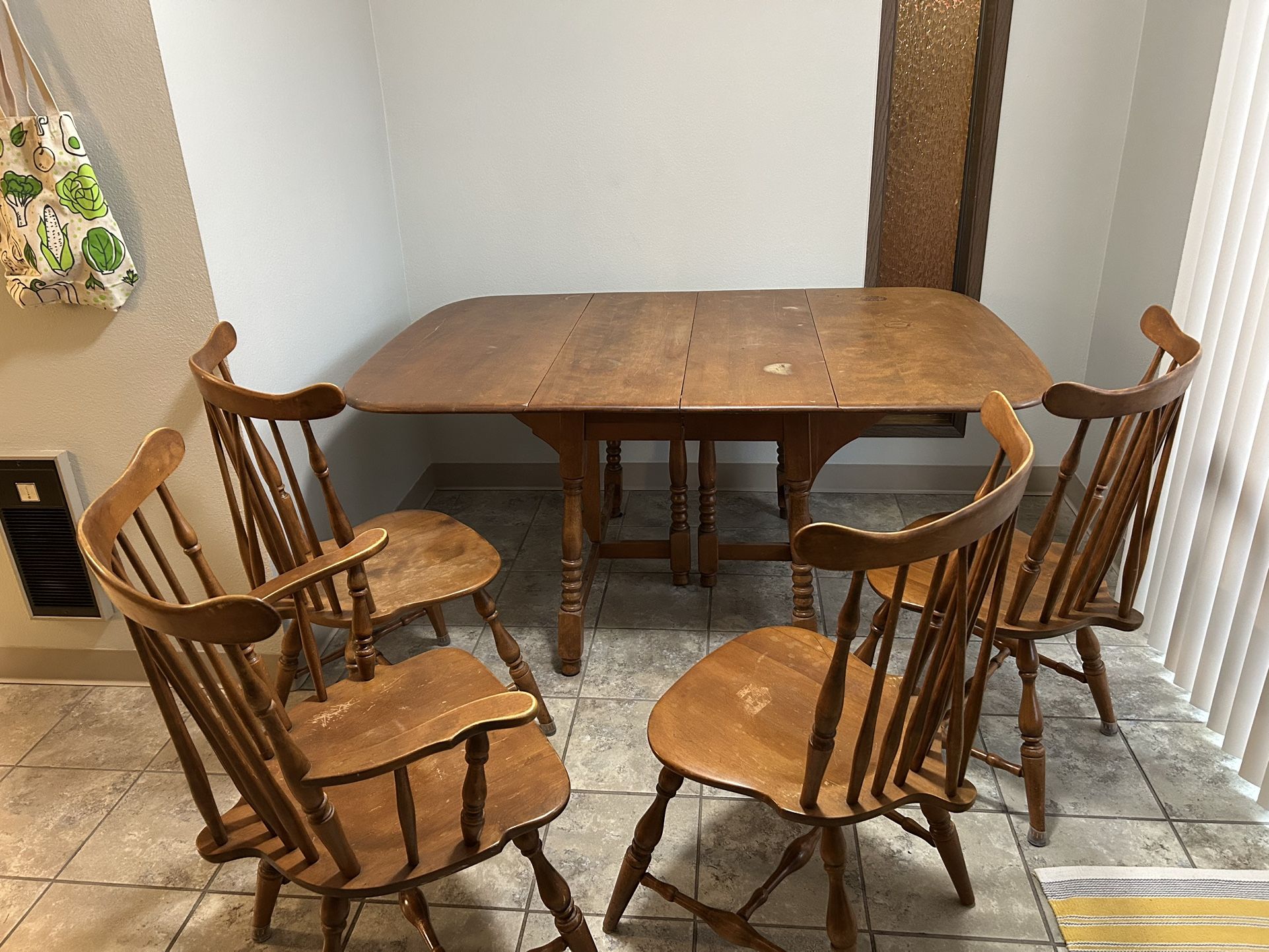 Antique gate legged Maple wood table that folds down on both sides, 4 chairs.