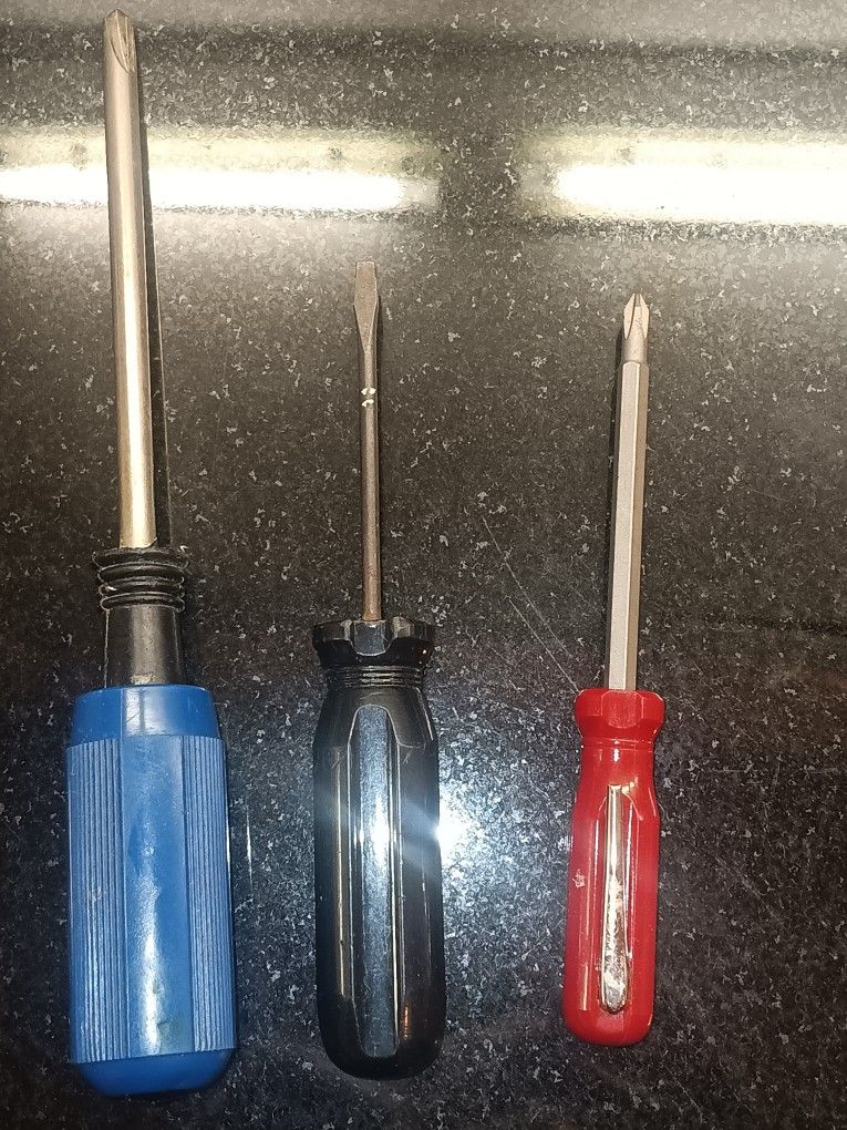 Set of three screwdrivers, including two flathead and one Phillips head. Various sizes included for different tasks. Metal shafts with durable plastic handles. BUNDLE $2