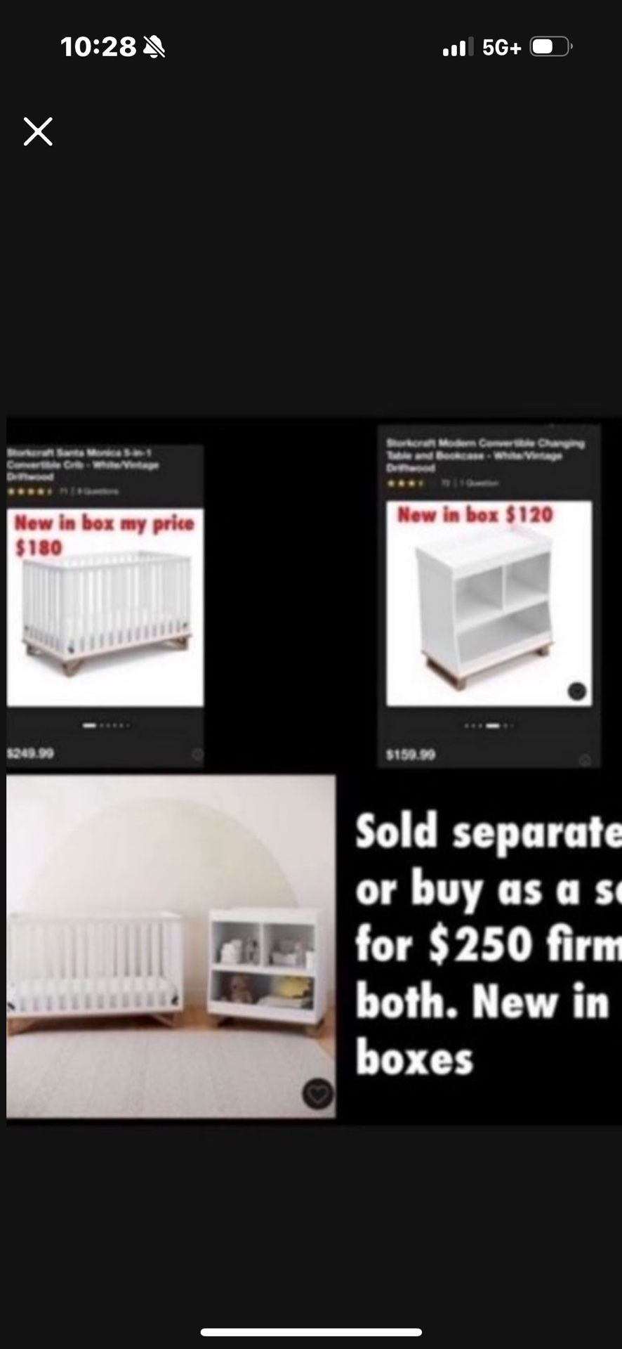New in box sold separately or together Crib new in box $180 Changing table new in box $120 Or take both for $250. Firm no lower Cash only East Palmd