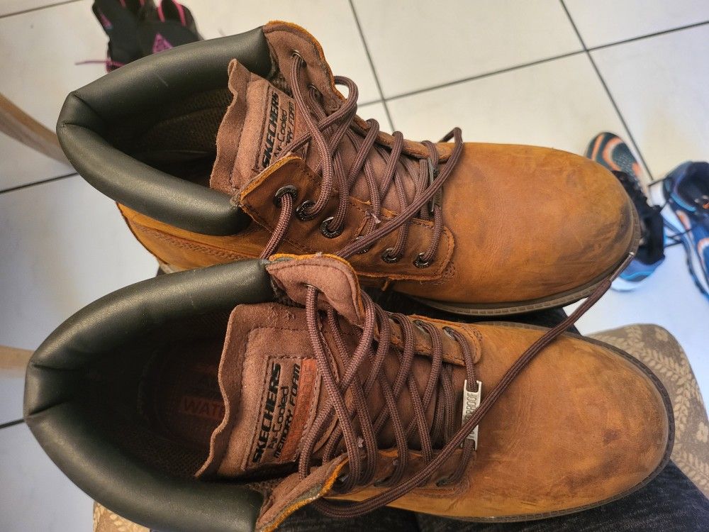 Skechers Mens Waterproof Brown Leather Boots Memory Foam $50 no box