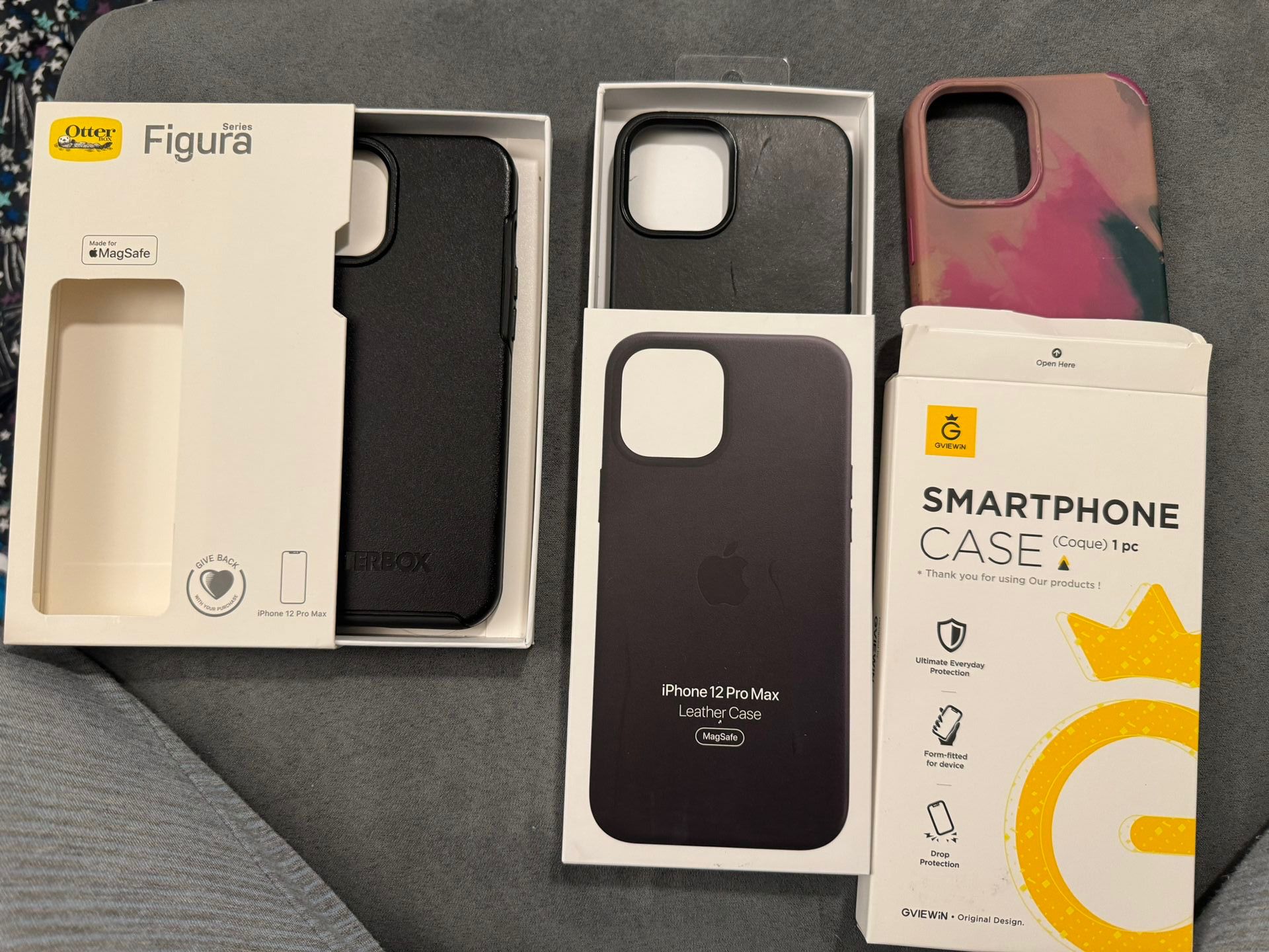 A set of three Iphone 12 pro max case Black otter box Black leather case Tie & dye leather case