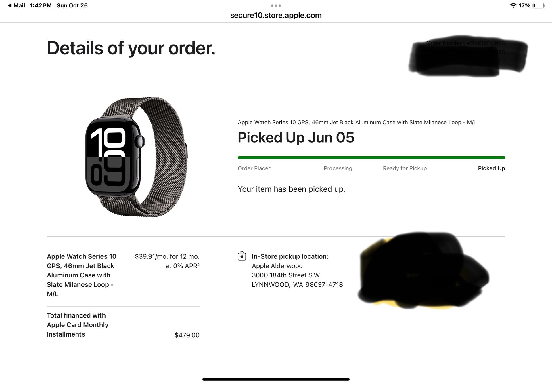 Apple Watch Series 10 GPS, 46mm Jet Black Aluminum Case with Slate Milanese Loop - M/L. $375