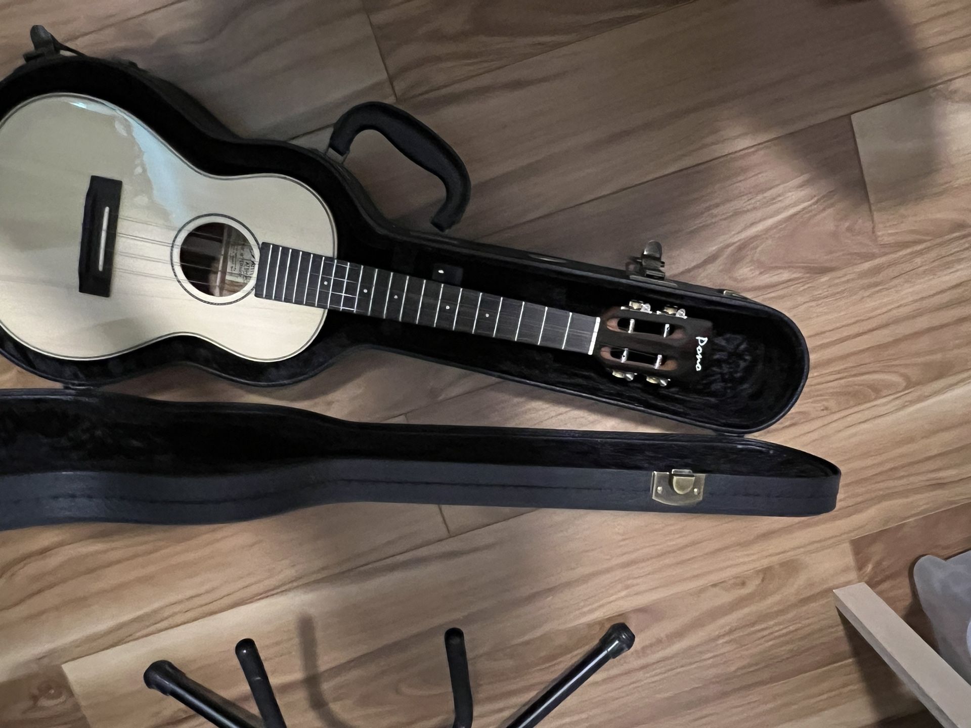 Like new condition, purchased directly from The Ukulele Site in 2021 but has been played very little. All solid wood, solid spruce top with solid acacia back and sides. Includes Hardshell case and Oasis humidifier. Open to full or partial trades with cash to me for small body acoustic guitars (OM/OOO, Concert, etc) or other ukuleles of any size except soprano