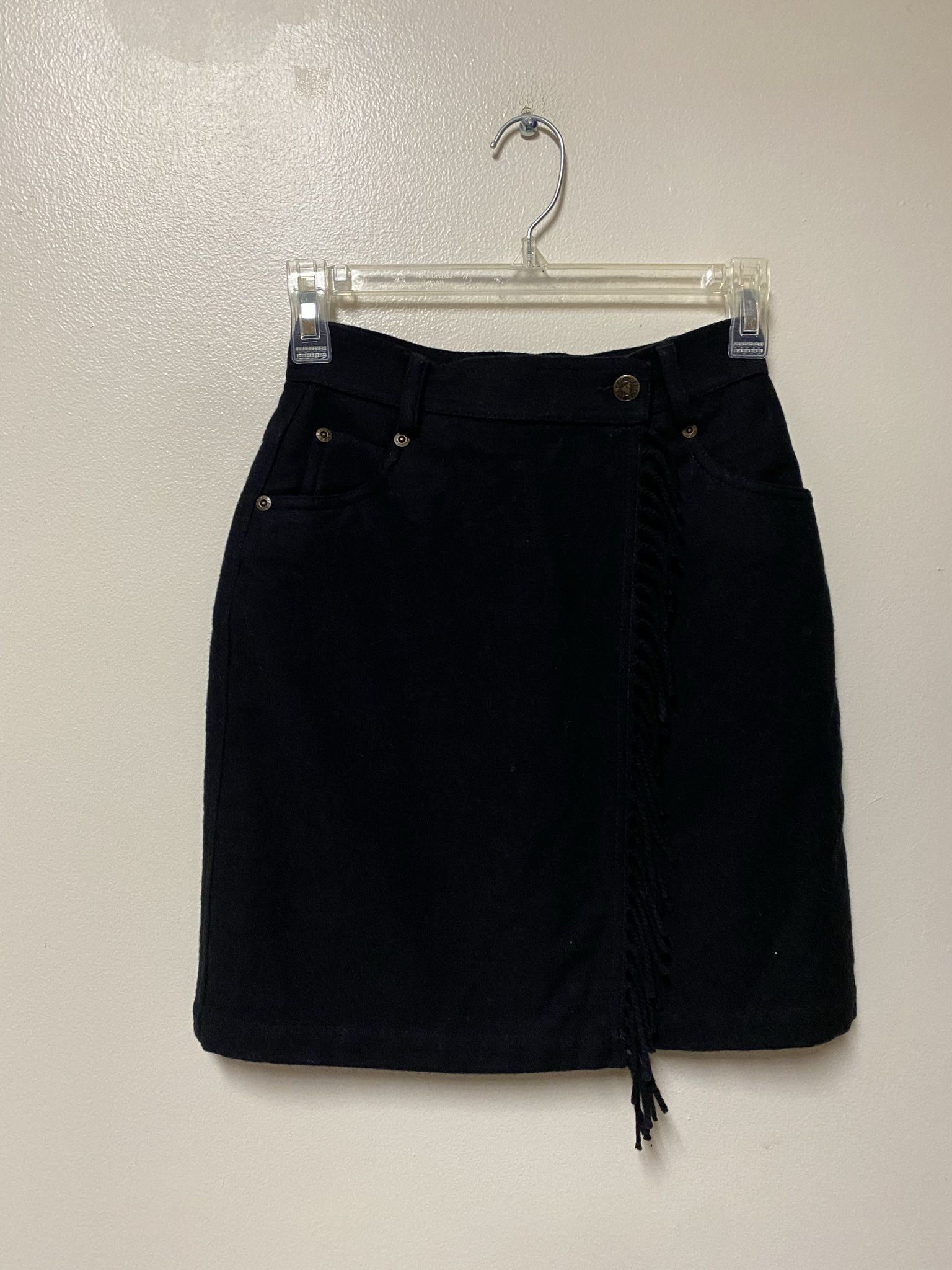 Women’s LIZ WEAR Wool/nylon black fringe short skirt… Size-2 petite… Waist 24”… Length 17 3/4”
