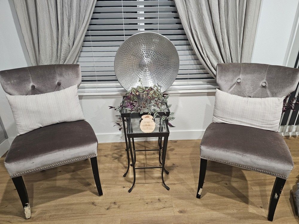 2 Accent Chairs - $200 Color - Lavender Fabric - Velvet Pillows included Minor scratches, legs need to be sanded and painted