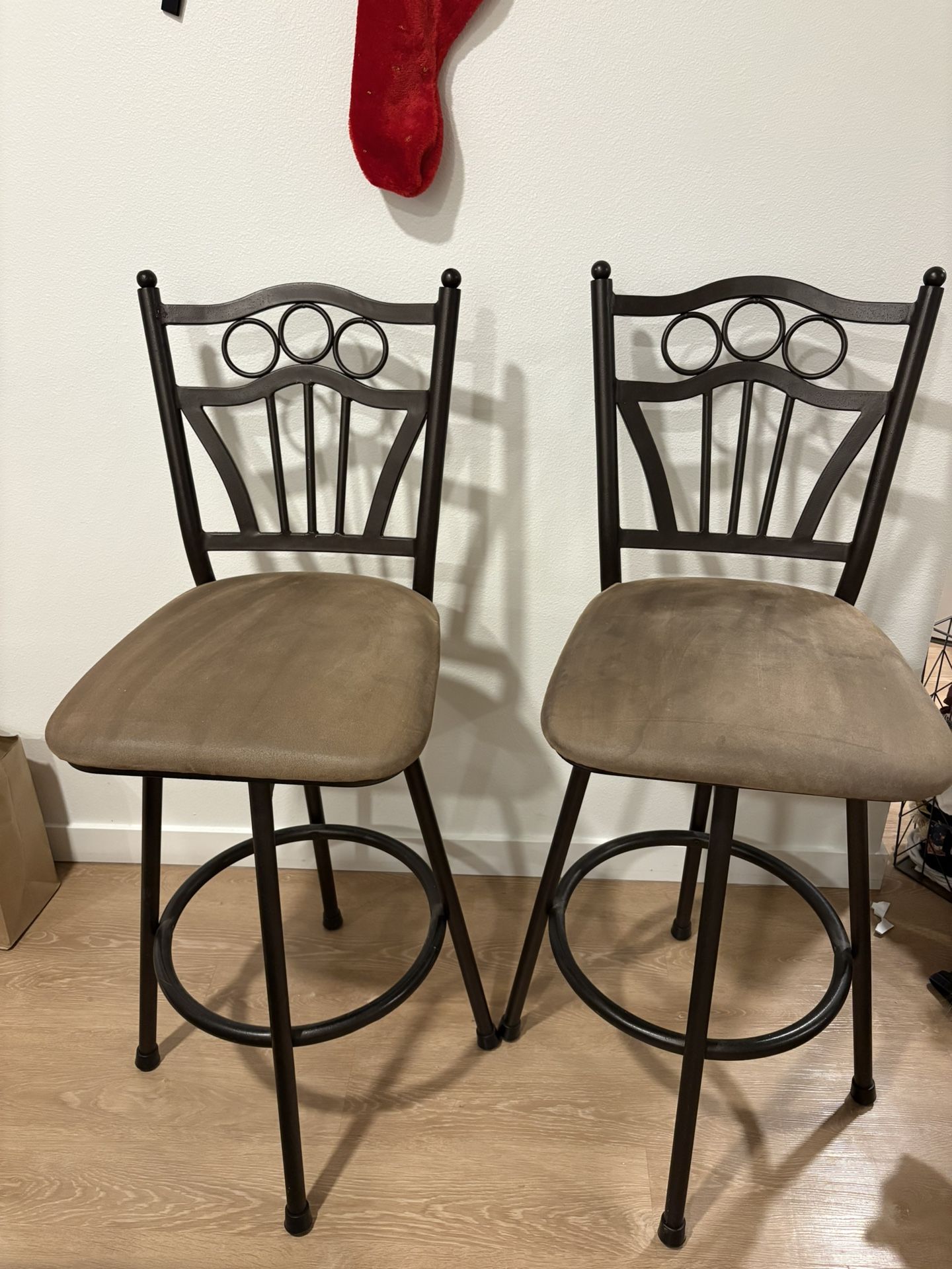 Two spinning bar stools. One has a stain. Would be a fun reupholstering project!