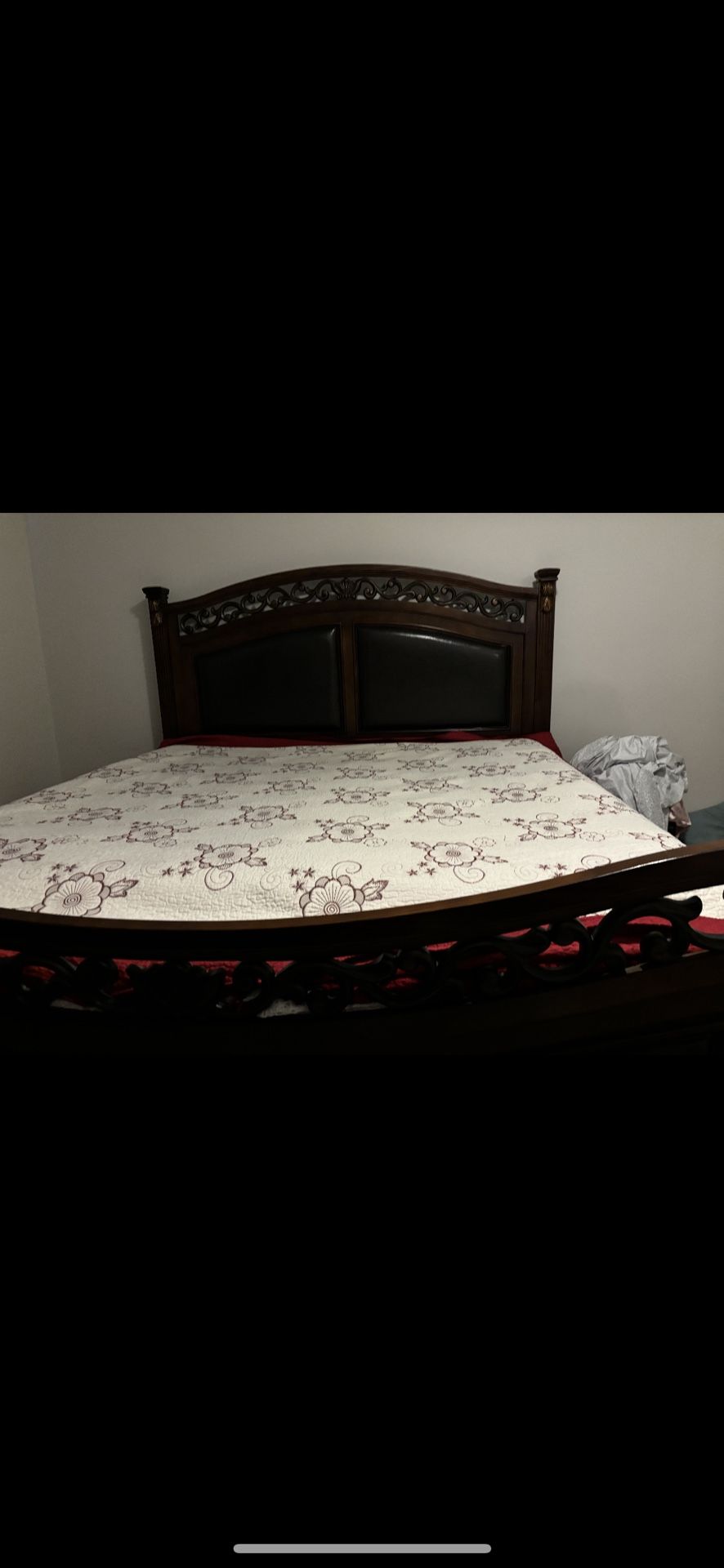 King carved wooded with leather bed, Mattress and wood frame included. Beautiful bed, very spacious and comfortable. Only had for 1 year and a half. In very new conditions and taken good care of. Always protected with the waterproof mattress protector. Feel free to reach out!