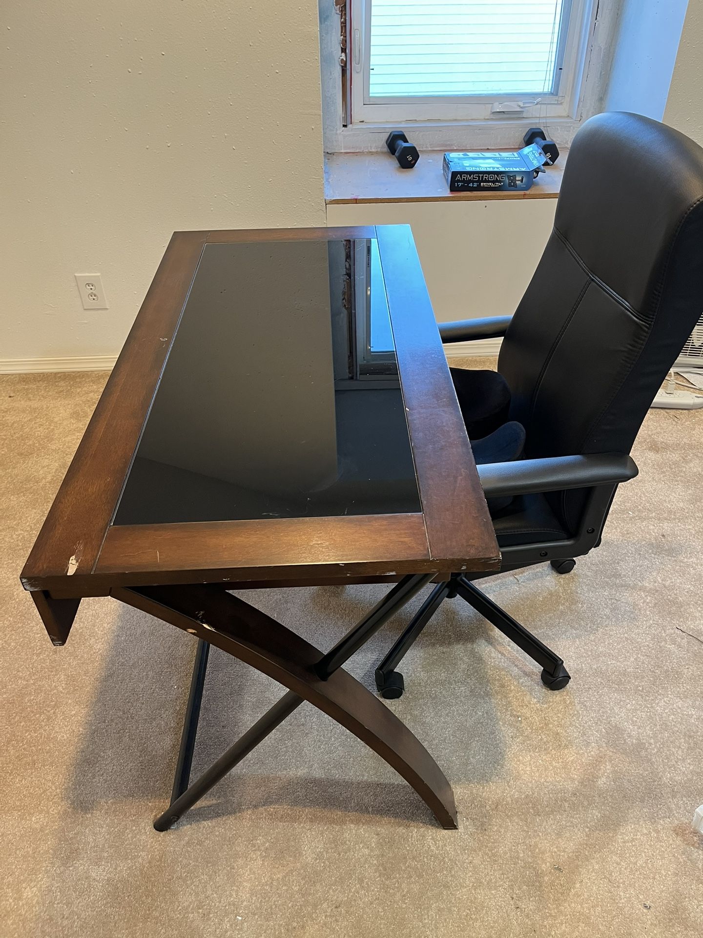 Desk is well used but still very sturdy. The chair is like new and has adjustable height. No reasonable offer will be refused.