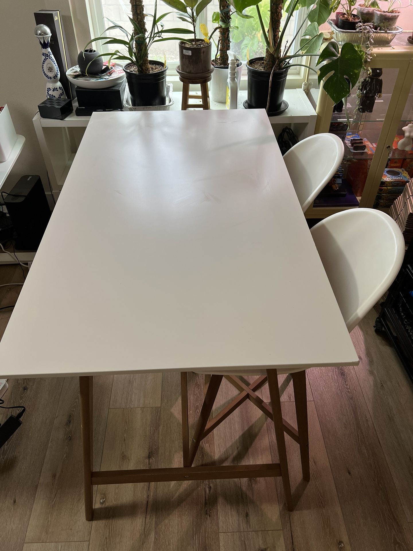 Table & chairs are discontinued from IKEA. Normal wear with small scratches. Table info; 55"W x 31"D x 38"H FANBYN chairs Tested for: 243 lb Width: 21 1/4 " Depth: 24 3/4 " Height: 40 1/8 " Seat width: 20 7/8 " Seat depth: 16 1/2 " Seat height: 25 1/4 " Pick up only. Selling as a set