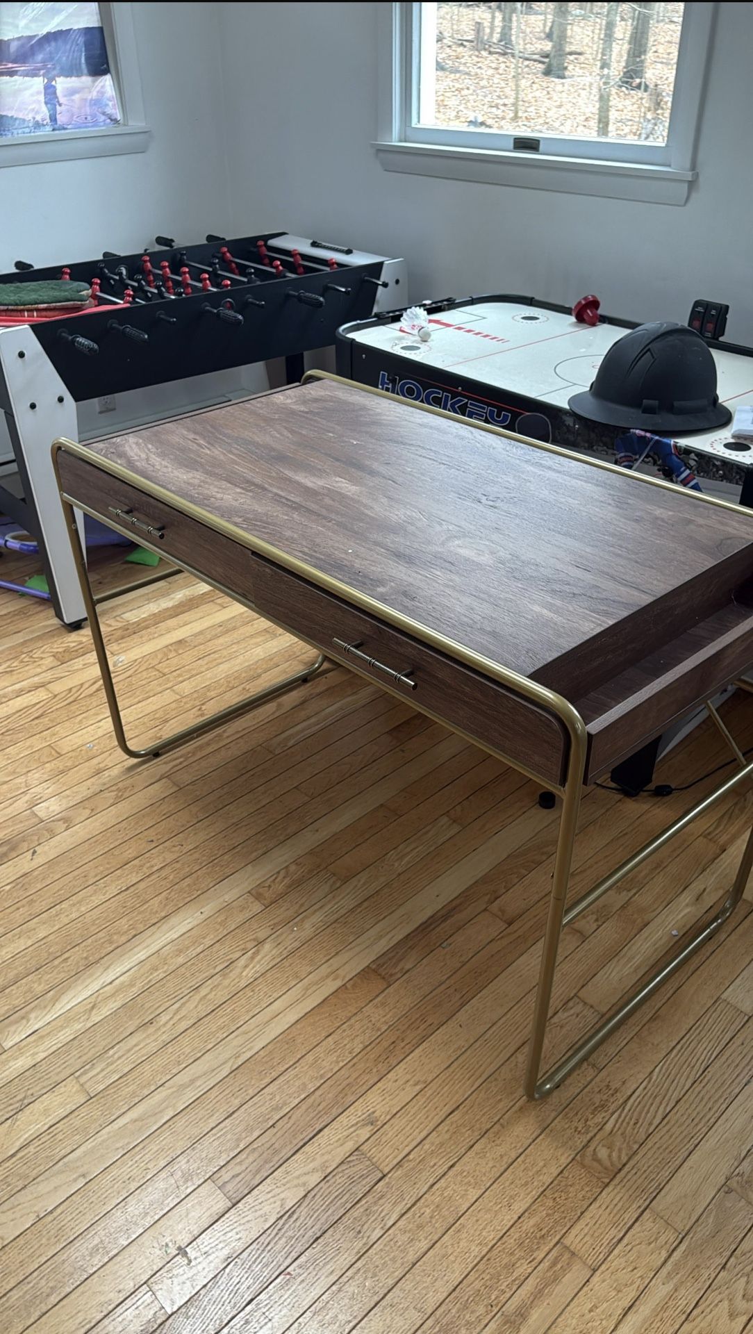 Brand Anivia Shape Rectangular Product Dimensions 47.3"D x 23.7"W x 30"H Color Rustic Oak Style Modern Base Material Metal Versatile Desk with Storage and 2 Drawers- 2 drawers provide ample storage space, keeping daily essentials within reach and off of your workspace. And 2 storage slots can store your notes, books , pens, paperwork, potted plant and more. Modern & Sturdy Workstation Table- The study desk is constructed of high-quality MDF to ensure the sturdiness and durability, and the golden metal frames provide a pristine and charming look to decorate your office or living room. Rustic Vintage Design Computer Desk - With waterproof, anti-corrosion, and durable enough to keep your office in delicate charm for a long time. Easy to Assemble & Clean- Includes guide with step-by-step instructions for assembly. Multi-Use: Makeup Vanity Dressing Table Desk