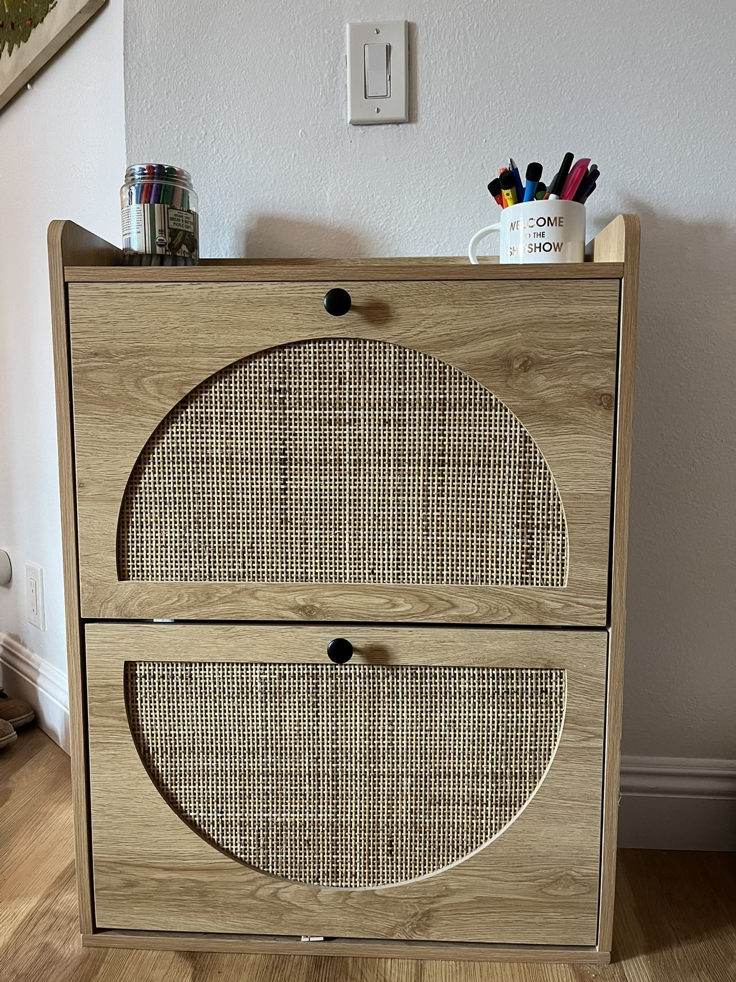 In good condition/barely used- fits up to 12 pairs of shoes (3 per row x 4)- ideally low tops so they can fit more easily. Nice look, hides shoes. I just have too many shoes, so I’m going to get a bigger one instead!