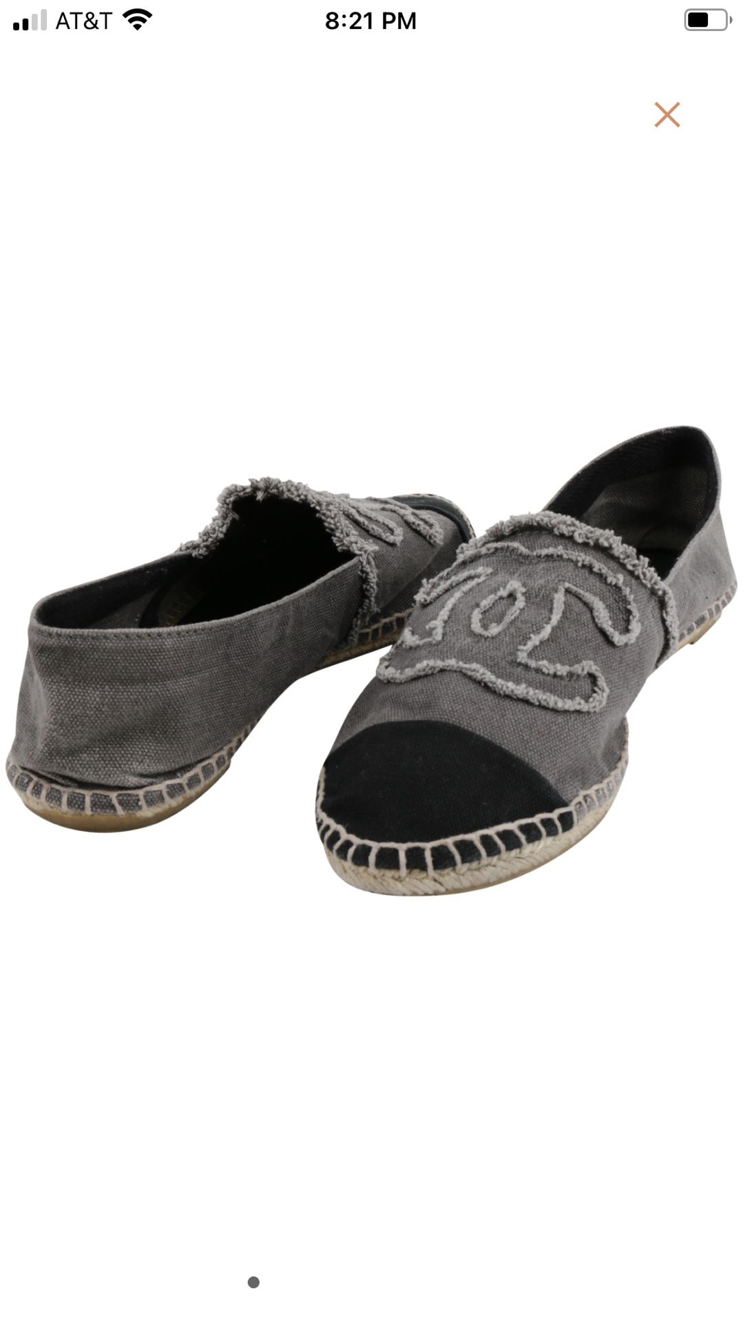 GB1080301-DO Chanel Woven Canvas/Fabric Round-Toe CC Logo Espadrille Flats Women's Size: US 11 / 41 EU Measurements are Approximate. (Please Take Note of the Size on the Tags as Shown in Pictures and/or Measurements Stated on the Description.) Chanel woven canvas/fabric CC espadrilles size 41 in gray & black. These espadrille flats have a natural fibrous textile midsole with a durable upper of gray canvas/fabric with a contrast black cap toe and a CC logo patch. Ask for Judy at Gold and Beyond