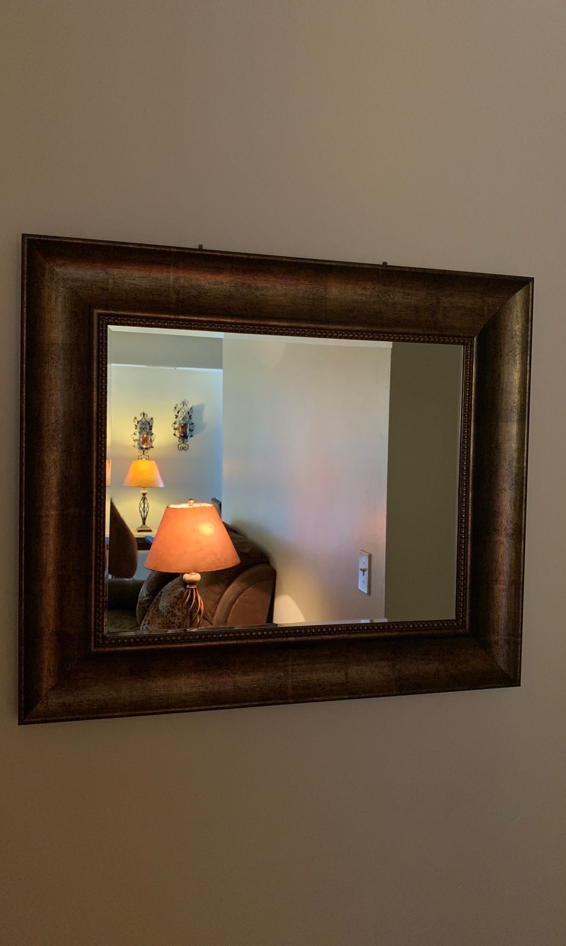 2 ft by 2ft mirror never touched and has not one scratch very nice design on it with brown details