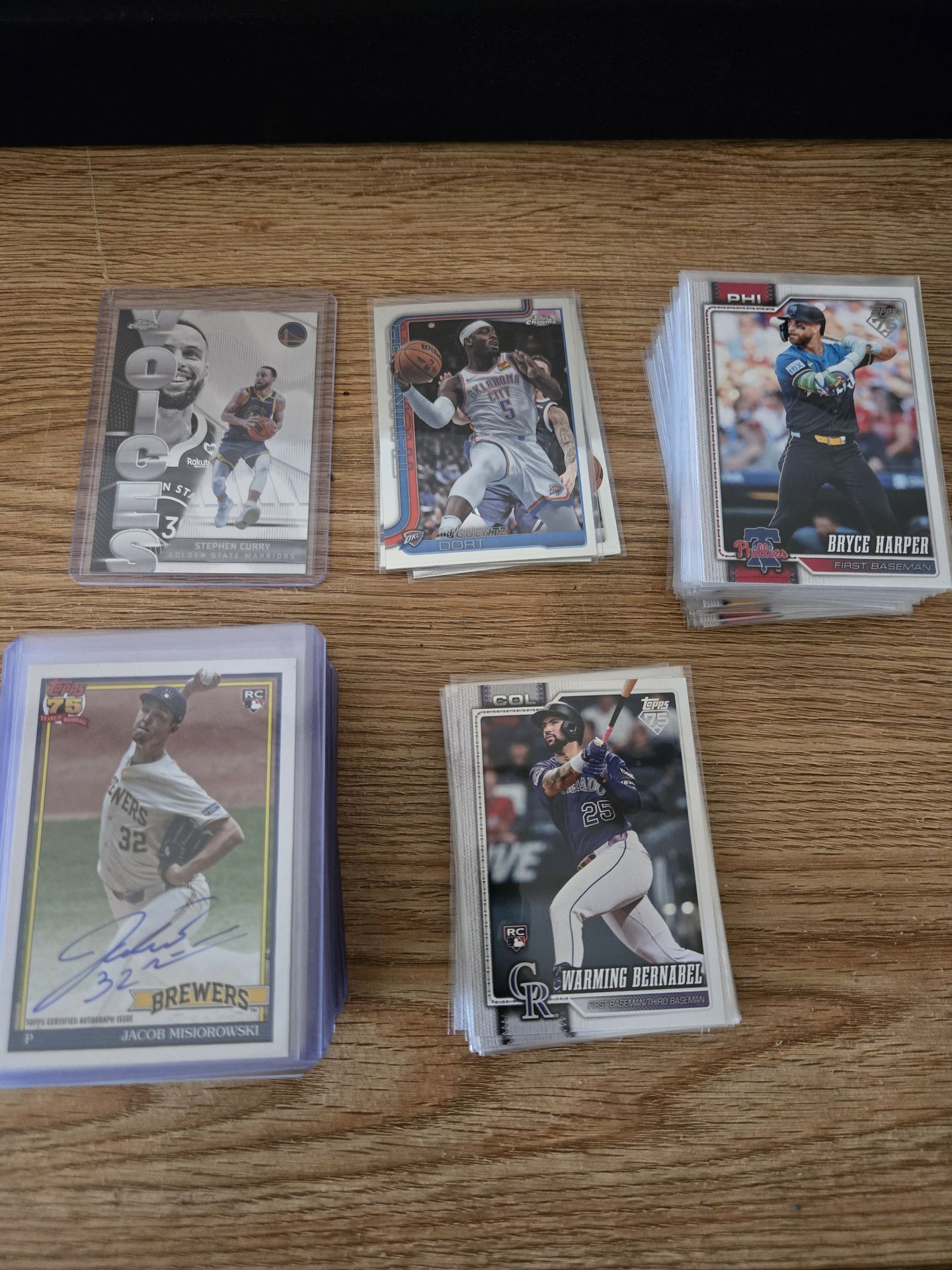 120 mlb cards '26 topps series 1 4 nba cards "26 topps chrome Few rc, some holo,foils and one auto All in new condition, all in sleeves, some wt top loaders Scanned all for average sold prices(collx,ebay) = $400+ Willing take $320 for all. obo