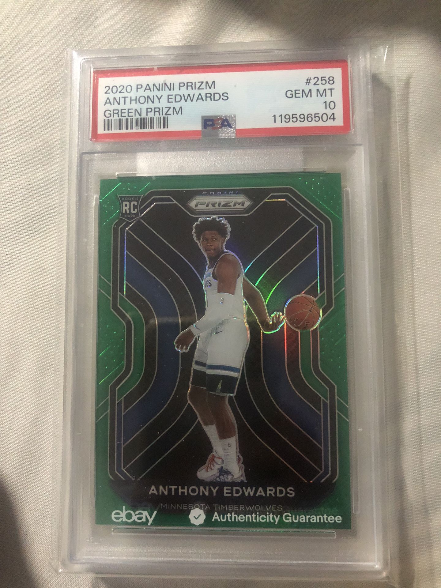 Anthony Edwards Green Prism Gem mint 10 with a PSA and eBay guarantee hologram on the back. One of a kind cards.