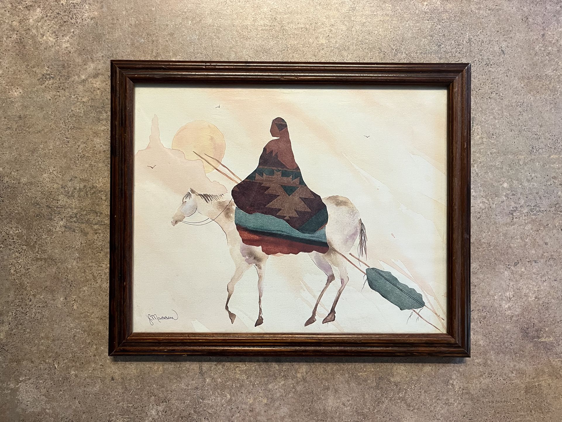 Vintage 90's - JC MADDEN Southwest Art Watercolor Print ”On Horse at Sunset" W/ Wooden Frame 9x11”