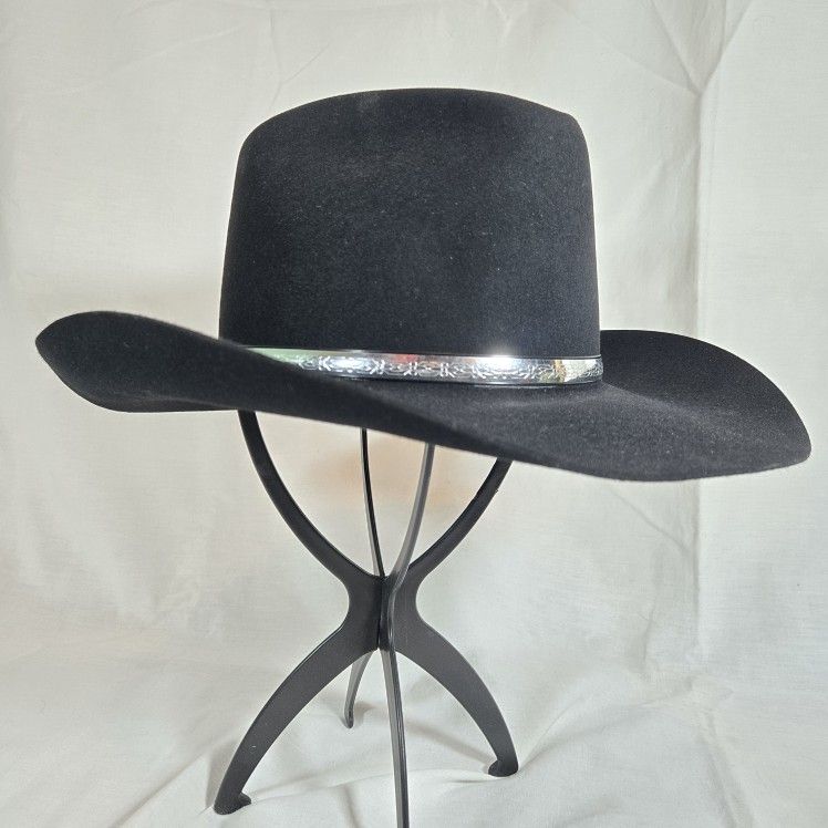 Vintage Resistol 'Quicksilver' 4X beaver Cowboy Hat in Black. Includes original 'Silver' hat band. 4X Beaver Quality Size 7 1/8 (57cm) 5" Crown 3 1/2" Brim Lightly worn, in good condition. Comes in original box. Asking $120, located near Gantzel and Combs in San Tan Valley.