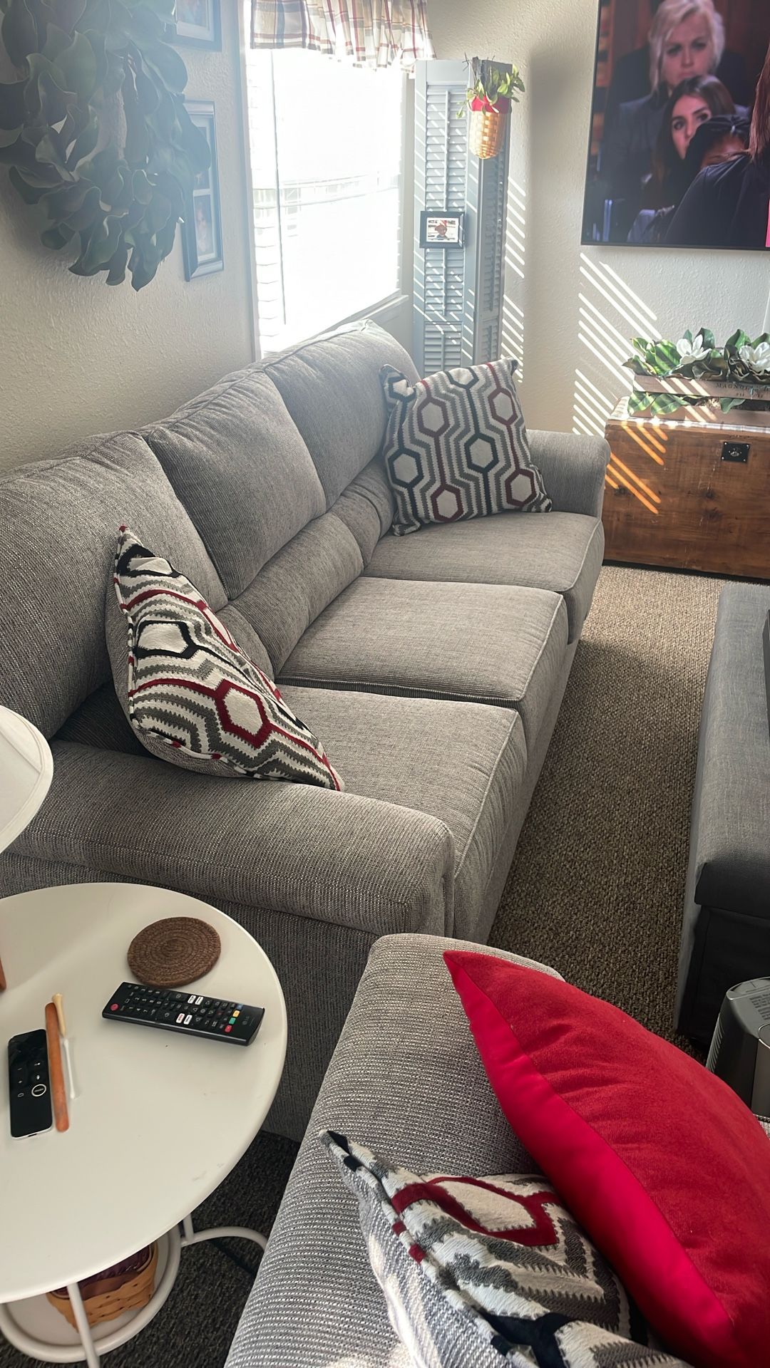 New couch. Hardly used. Less than 2 years old. Finding it's too big for space. 88 inches long x 39 wide. Pillows included. No stains rips or tears. Like new. Cash or Venmo