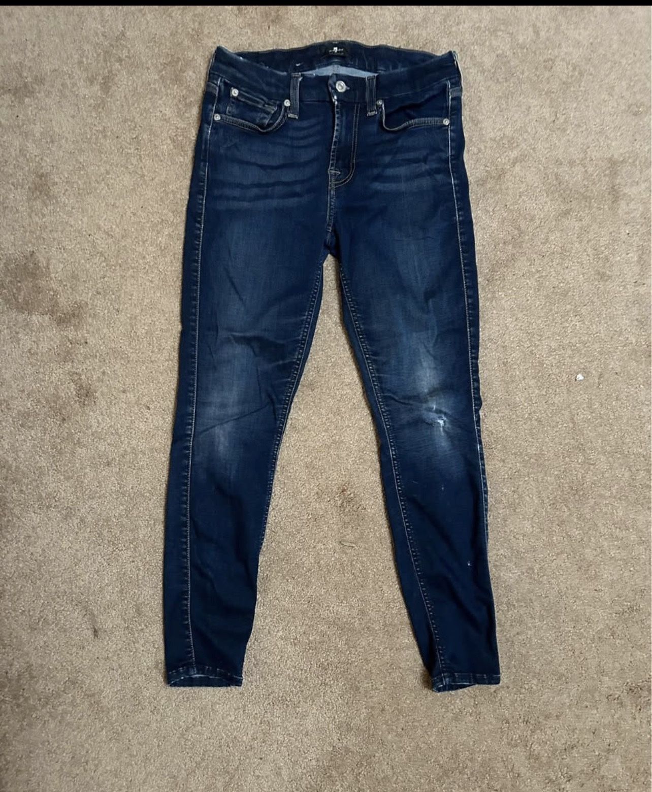 Brand: 7 For All Mankind Style: The Ankle Skinny (ankle-length skinny fit) Color/Wash: Indigo Condition: Used. In good overall shape but there is a small hole in the knee (see photo). No major stains or rips elsewhere.