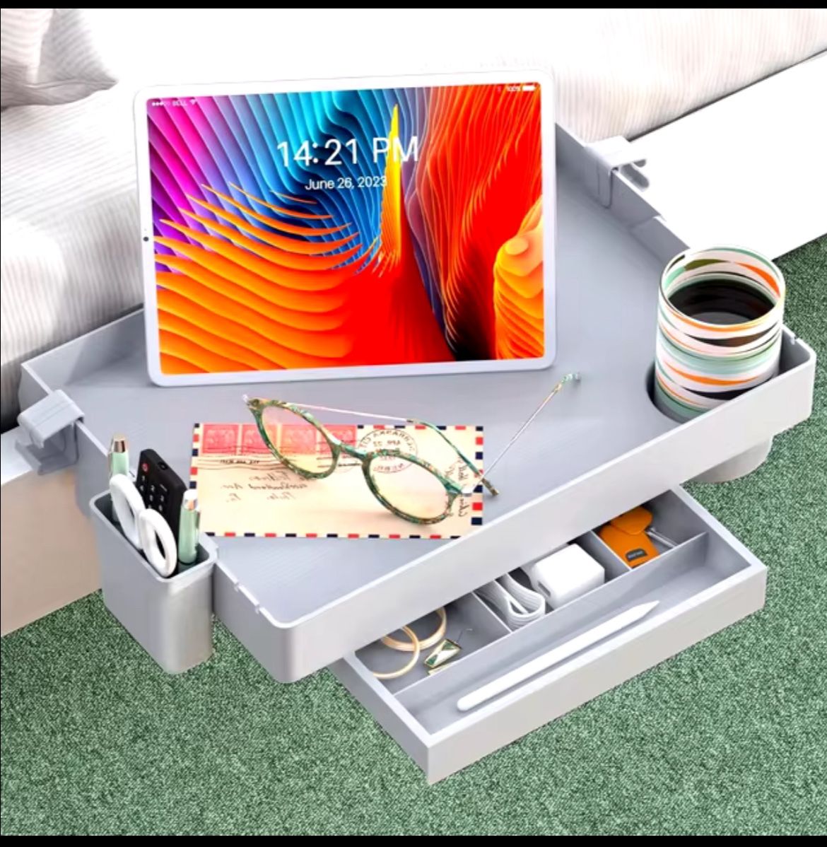 Brand New Bedside Shelf for Bed, Foldable Bunk Bed Shelf Clip On Nightstand Tray College Dorm Room Essential Table Caddy with Cup Holder (Gray)