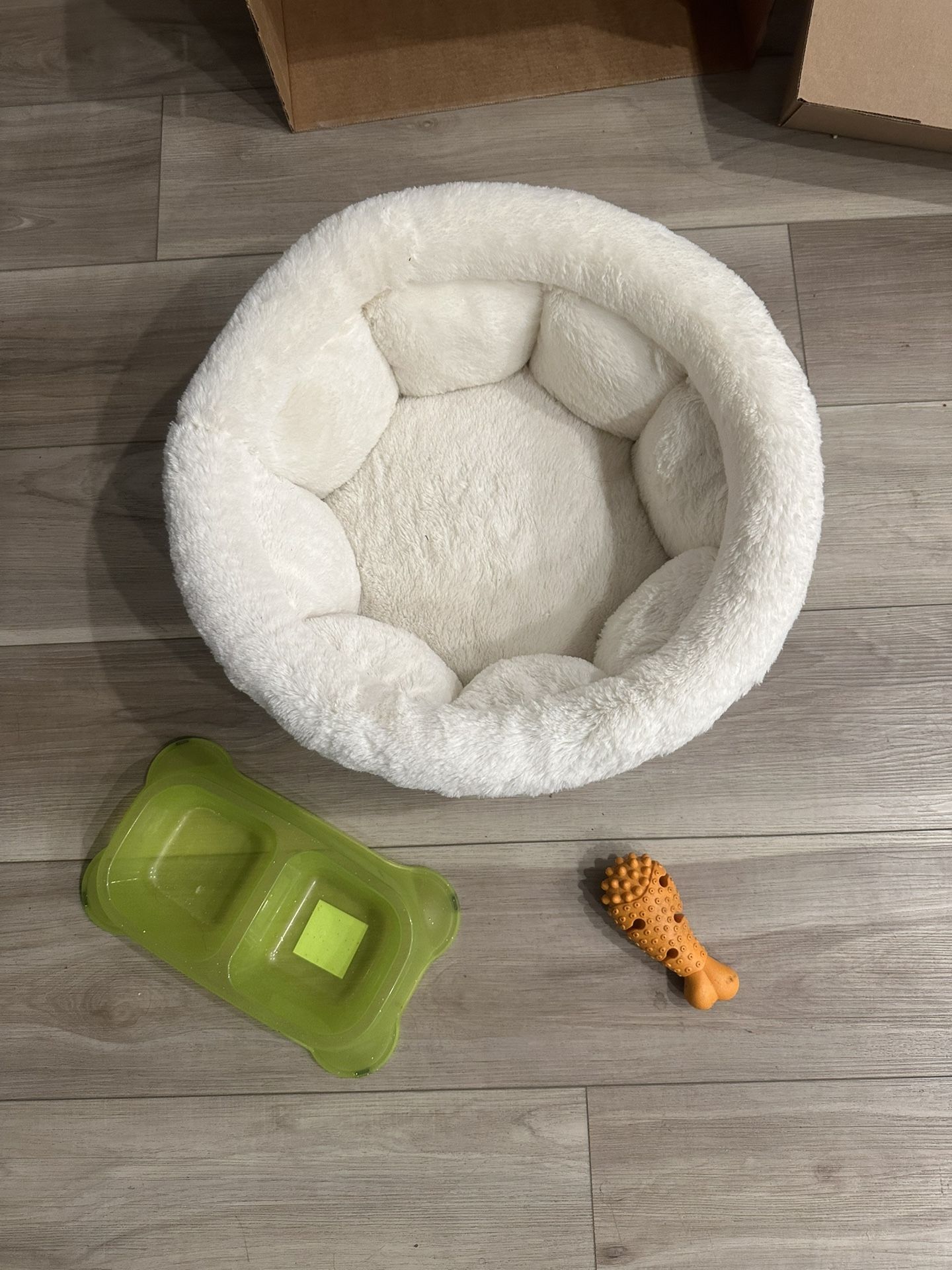 Cozy fleece reversible bed for cat or dog. Opened but never used. Dog chew toy with teething ridges and treat pockets for a stimulating reward. Plastic food and water bowl