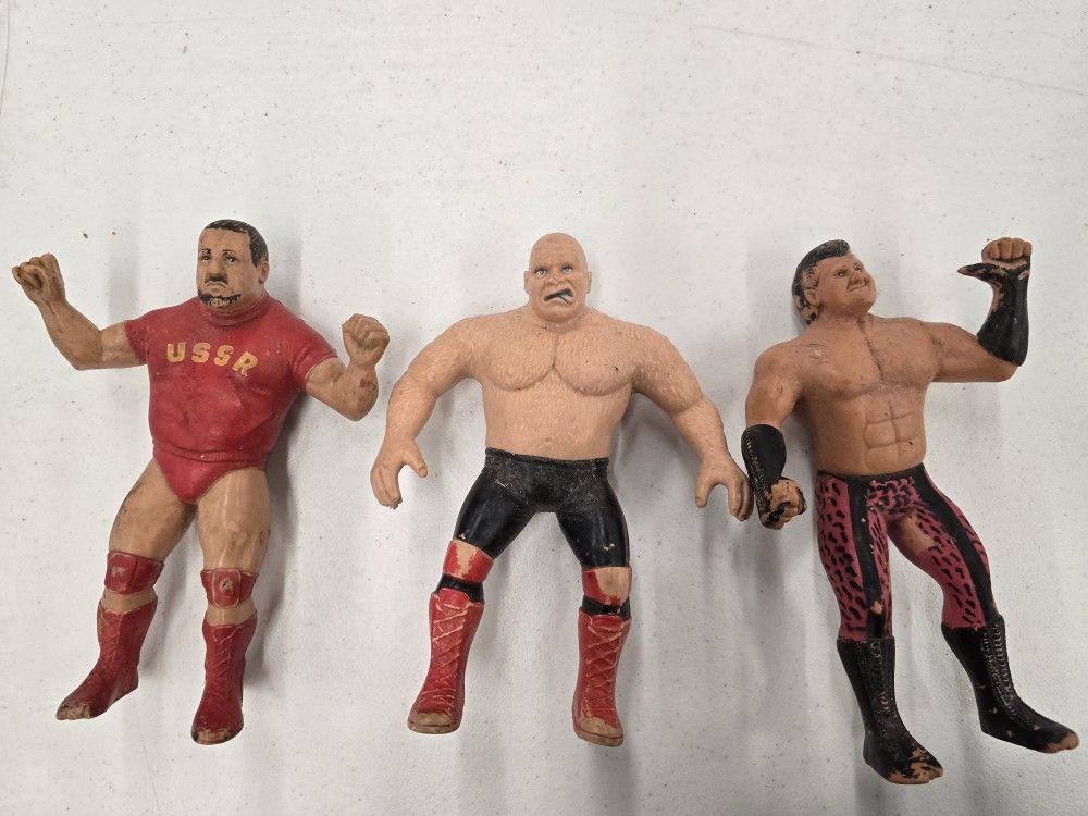 Vintage 1980s TITAN WWF LJN Rubber Larger Wrestling Figurines. Nikolai looks to have a nip off to the front rubber of his one foot- see photos and ask for additional if needed. These have been used, some paint is wearing. Need cleaned (stored away in a barn for a while). LJN is the brand you want to look for! George Animal Steele Brutus Beefcake Nikolai Volkoff Getting all 3 $55 / Lorain pickup or Shipping Available