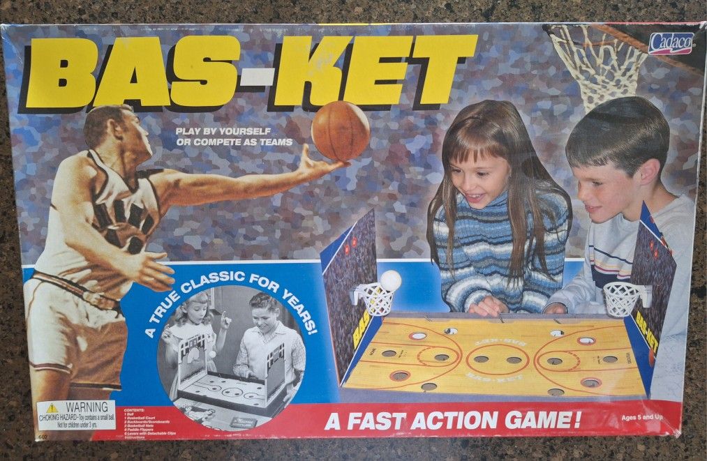 Bas-Ket, Cadaco's beloved dexterity basketball game, was produced from 1938 until 2004, featuring spring-loaded levers to flick a ping-pong ball through hoops on a dimpled board, with gameplay simple yet strategic, making it nostalgic classic. Gameplay: A two-player dexterity game where players use levers (flippers) to shoot the ball into the opponent's basket, with scoring similar to real basketball. Unique Features: The board had dimples and angled levers for varied shots, including corner shots and free throws, allowing for strategic play, notes the {BGG}. History: First released in 1938, it was a long-running hit, with its production ending around 2004. Great unique gift idea!