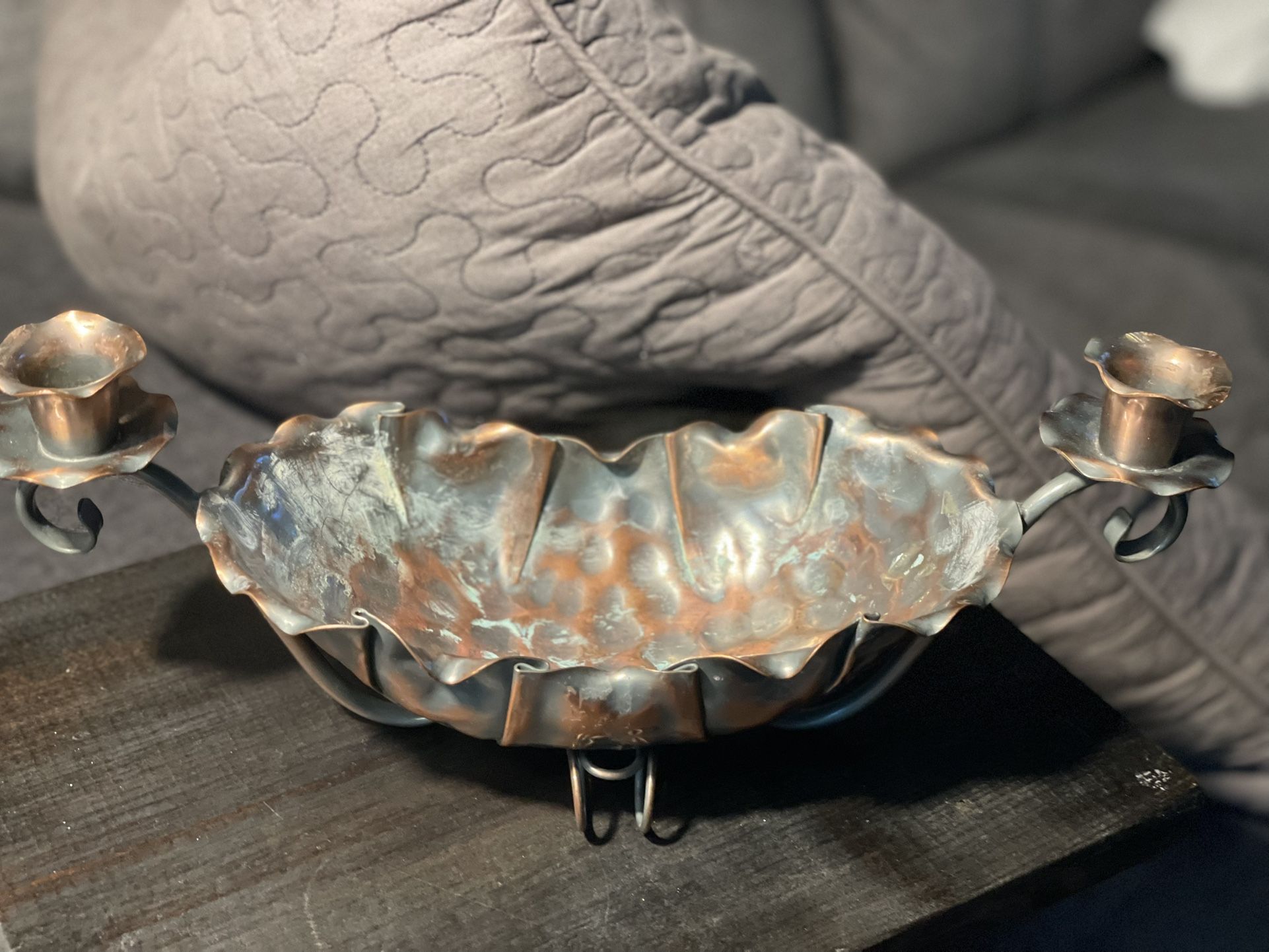 A vintage "Gregorian Copper" oblong bowl with two candle holders on each side. Perfect centerpiece - fill it with fruit or greens, light your candles