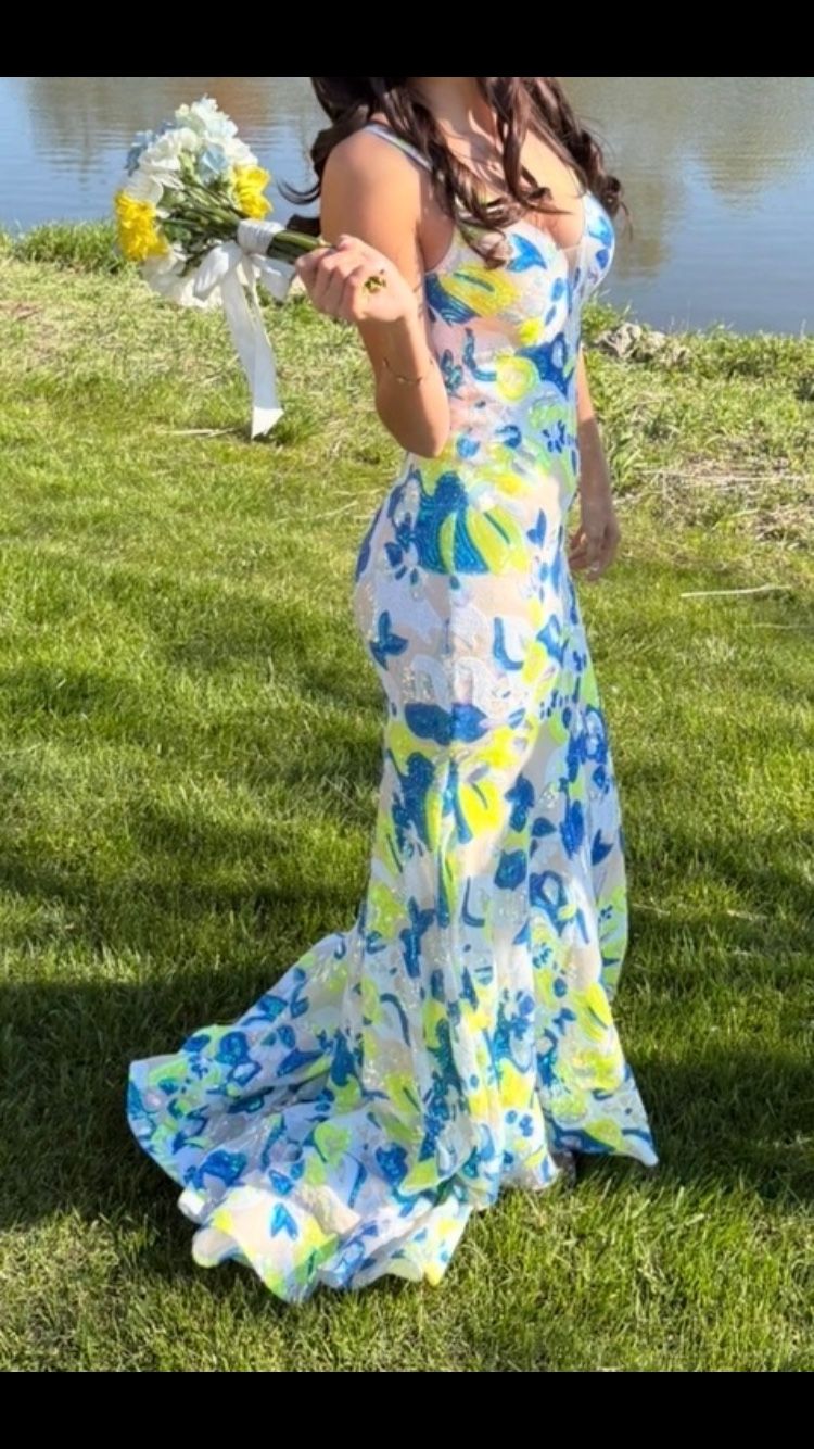 White with yellow and blue size 00 Bought at Gipper Prom outlet