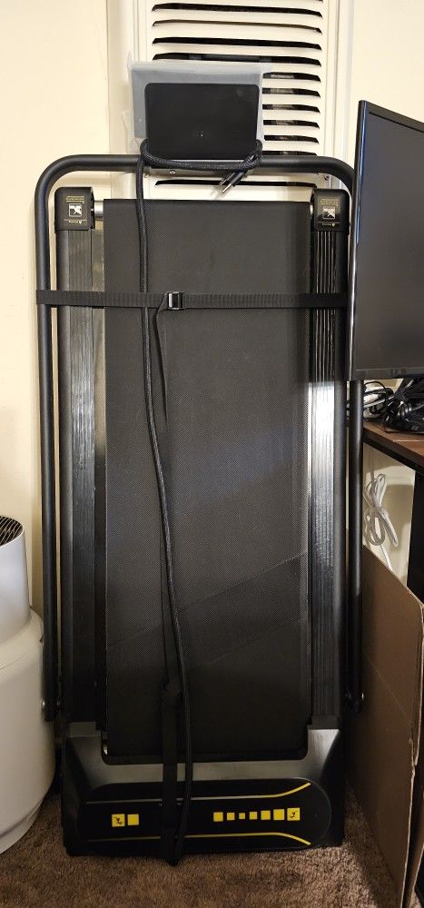 Used a few times. Comes with foam block risers and remote control. Has handle to hold phone. Selling to make space. Up to 6 kilometers per hour and 3% incline 37.4" long and 15" wide