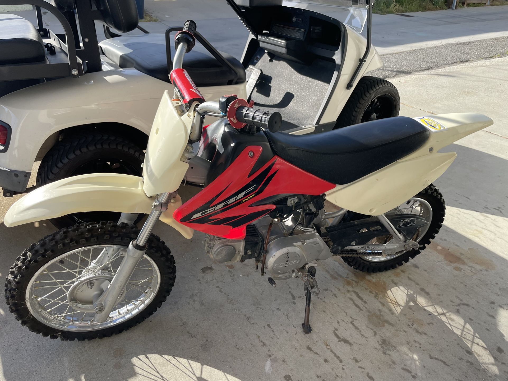 Great bike, have had it quite a few years. Brand new oem honda carb and air intake last year with only one ride on it since. Kid ridden only. My girls have outgrown. Pink slip on hand. Back tire is brand new but has flat inner. Have extra inner to give. Also, front brake lever was taken off for learning purposes. Have hardware minus the lever but that’s a $15 part. Thank you for looking