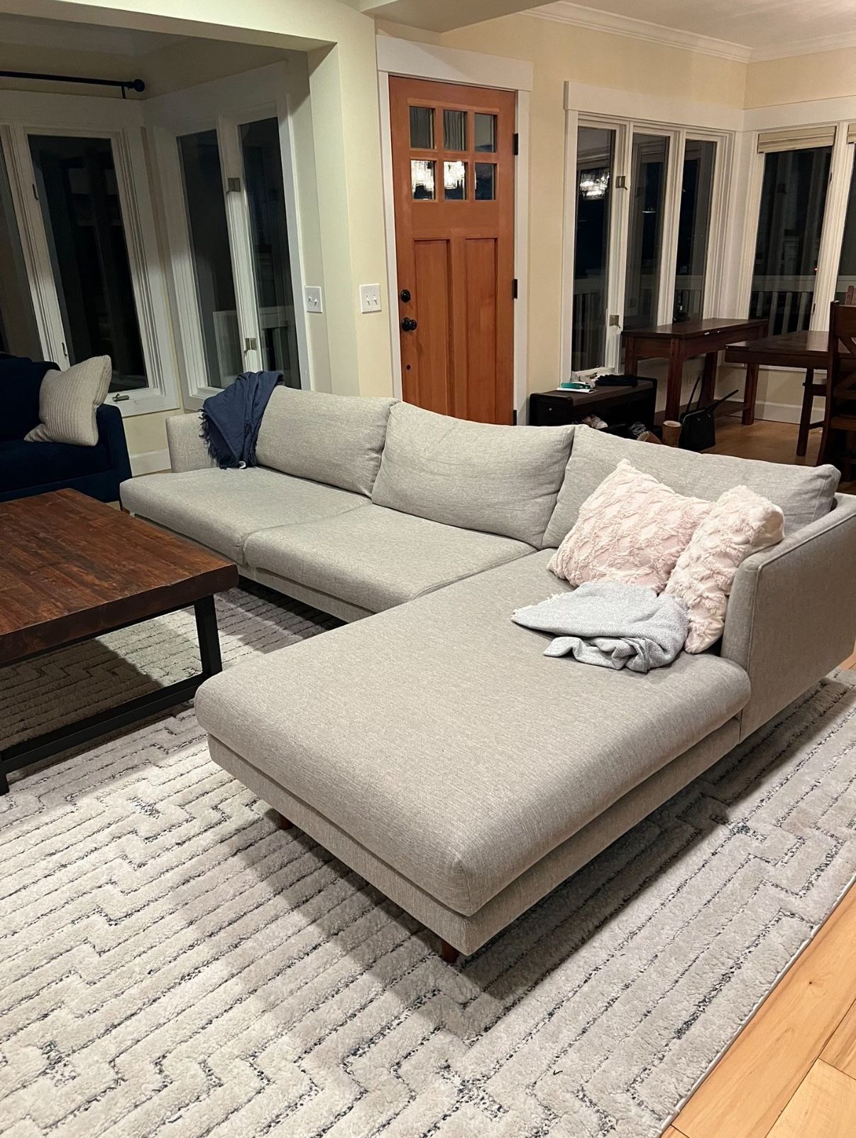 - Upholstered in a soft, durable fabric - Solid and composite wood frame - Solid wood legs - Loose, reversible seat and back cushions with removable covers - Foam-padded and fiber- and feather-filled cushions General Dimensions 33"H x 112"W x 63"D You can go to the Article page to get exact dimensions of each piece. Thanks! Pick up only in Kirkland