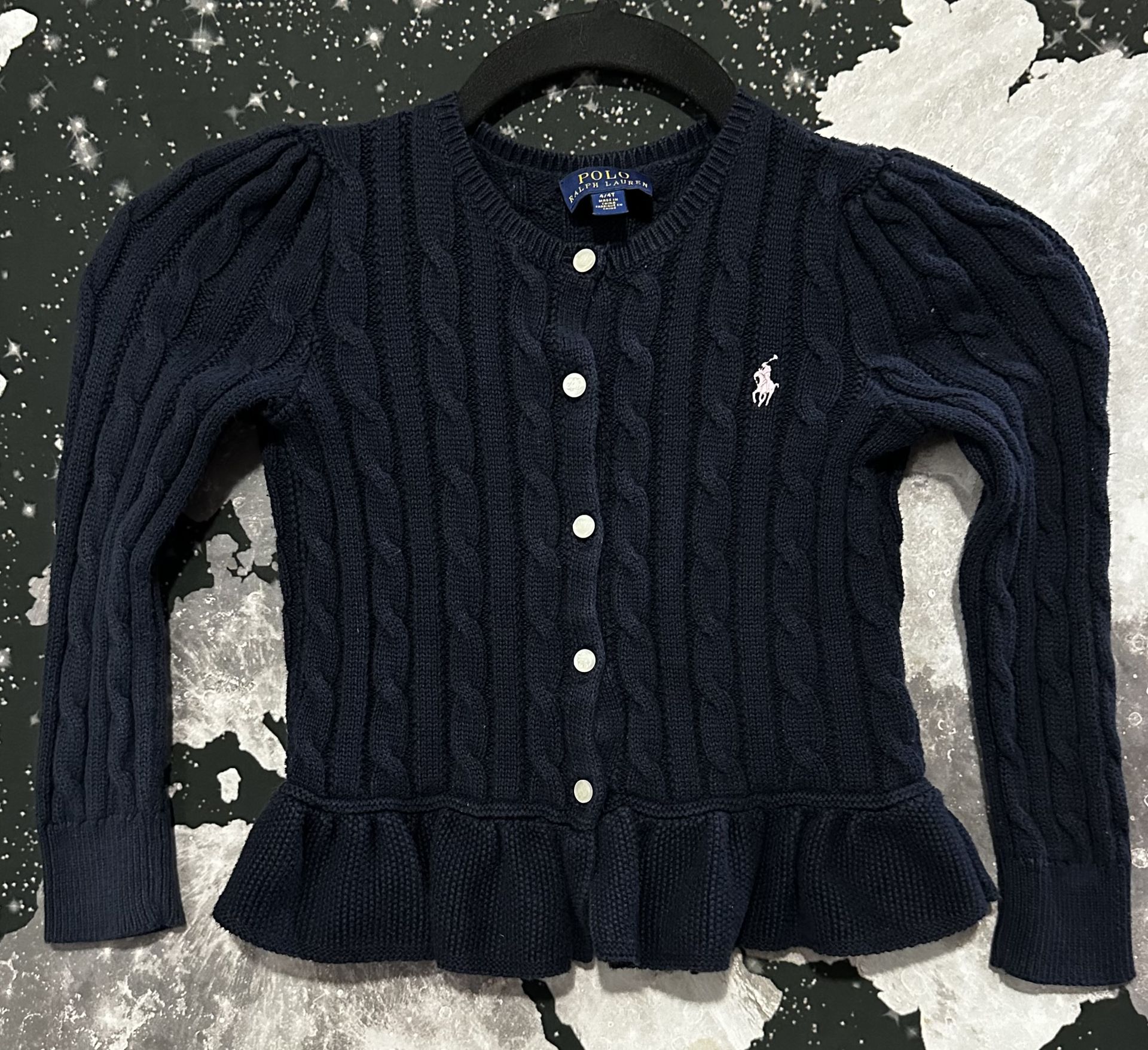 Polo Ralph Lauren girls peplum cable knit style cardigan sweater, color is navy with pink embroidered horse logo & front button closure. Preowned condition Sz. 4T Measurements (12”x14” /Sleeve 15”)
