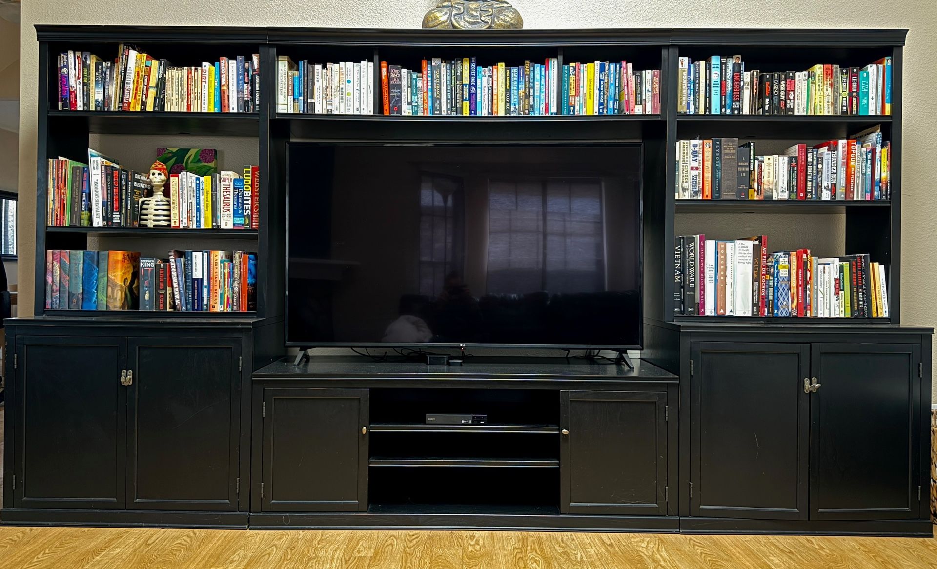 Black entertainment center from Pottery Barn. Books/TV not included. Very heavy you will need help moving. Asking $100/OBO. Cash/pick up only