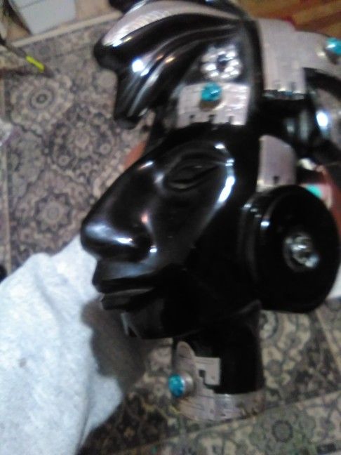 This was picked up at an estate sale and it is not complete it looks like it went on a pole of some sort of base with that said please pay close attention to the pics I just put in. This is one of the neatest obsidian carvings I have seen. It is very heavy at least three pounds.