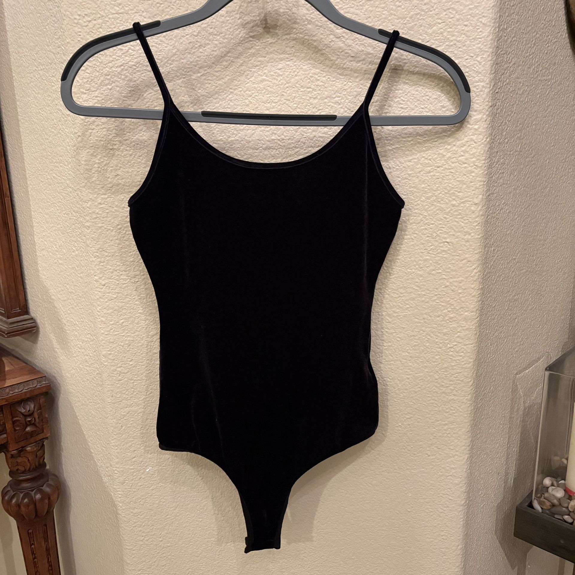 Pre-owned in great condition with no rips or stains. Elegant black velvet bodysuit with spaghetti straps. Perfect for a chic look. Made in USA. Comes from smoke and pet free home. Chest 14”