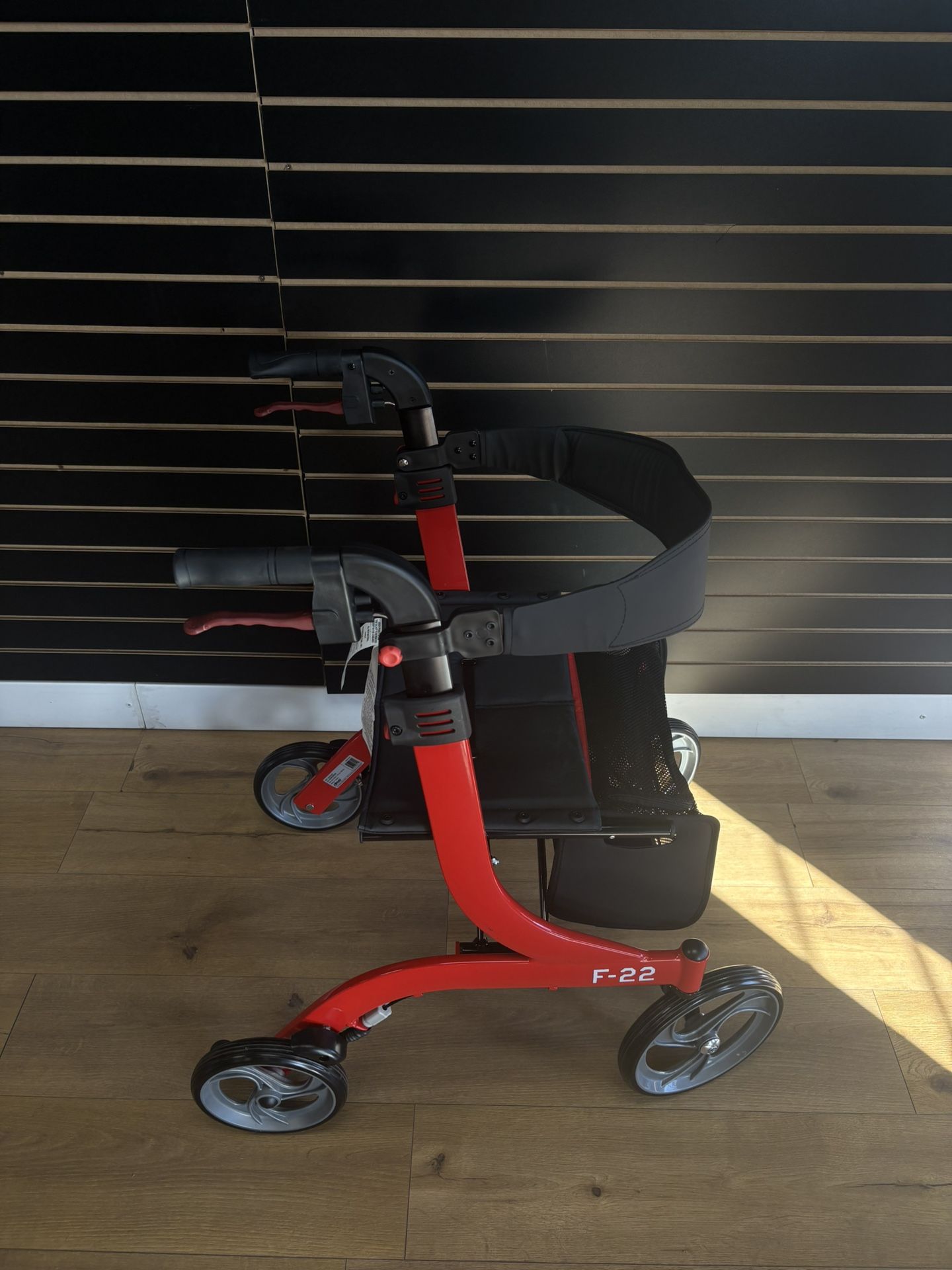 Brand new Drive F-22 red rollator. Has comfy seat and backrest. Comes with a handy storage bag under the seat for your stuff. Brakes on handles for easy stopping. Super smooth wheels too!